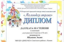 Поздравляем Ибушеву Эндже (преподаватель: Аксакова-Хусаенова А.В., концертмейстер: Бутовецкая О.А.) - Лауреата III степени VI Открытого городского конкурса юных исполнителей "Маленькая страна"! Желаем дальнейших творческих успехов и новых побед!