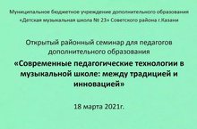 18 марта 2021 года в МБУДО «Детская музыкальная школа №23» Советского района г.Казани в дистанционном формате состоялся открытый районный семинар для педагогов дополнительного образования. Тема семинара: «Современные педагогические технологии в музыкальной школе: между традицией и инновацией». Программа семинара, состоящая из трех тематических блоков: «Развивающий потенциал современных педагогических технологий в системе музыкального образования», «Традиции и современность народно-инструментального исполнительства в художественно-эстетическом воспитании обучающихся ДМШ» и «Из опыта использования инновационных авторских методик в образовательном процессе ДМШ», включала в себя 11 выступлений преподавателей МБУДО «ДМШ №23». Для участия в семинаре в качестве слушателей подали заявки 45 преподавателей и педагогов дополнительного образования из МБУДО «ДШИ №4», МБУДО «ДМШ №21», МБУДО «ДМШ№19», МБУДО «ДШИ №6», МБУДО «ДМШ №30», МБУДО «ЦДТ пос. Дербышки» и ЦДТ «Танкодром». В качестве обратной связи слушатели направили на почту МБУДО «ДМШ №23» анкеты по итогам семинара. Анализ анкет участников позволяет сказать, что дистанционный формат проведения семинара позволил принять в нем участие большему количеству преподавателей, дал новые возможности для воплощения творческих идей докладчиков, позволил получить более качественную обратную связь от слушателей семинара.