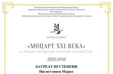 Поздравляем Нигметзянова Марко (преподаватель: Дроботова А.С.) - Лауреата III степени IV Международного конкурса пианистов "Моцарт XXI века"! Желаем дальнейших творческих успехов и новых побед!