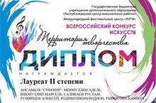 Лауреат II степени - Ансамбль "Сувенир": Миннуллин Адель, Бикмуллин Марсель, Саликаев Рустам, Румянцев Алексей, Родимушкин Родион, Тынысова Камиля; преподаватели: Бадрутдинов Р.М., Клименко О.В., концертмейстер: Катков А.Н.