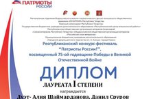 10 ноября 2020 года в МБУДО «Городской дворец детского творчества им. А.Алиша» г. Казани состоялся Республиканский конкурс-фестиваль "Патриоты России!", посвящённый 75-ой годовщине Победы в Великой Отечественной войне. Дуэт - Алия Шаймарданова, Данил Сруров (преподаватель: Харасова А.А.) - Лауреат I степени. Поздравляем и желаем новых побед!