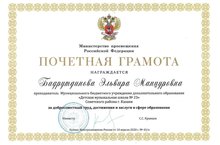 Поздравляем преподавателя ДМШ №23 Бадрутдинову Эльвиру Манцуровну с награждением Почётной грамотой Министерства просвещения Российской Федерации за добросовестный труд, достижения и заслуги в сфере образования!