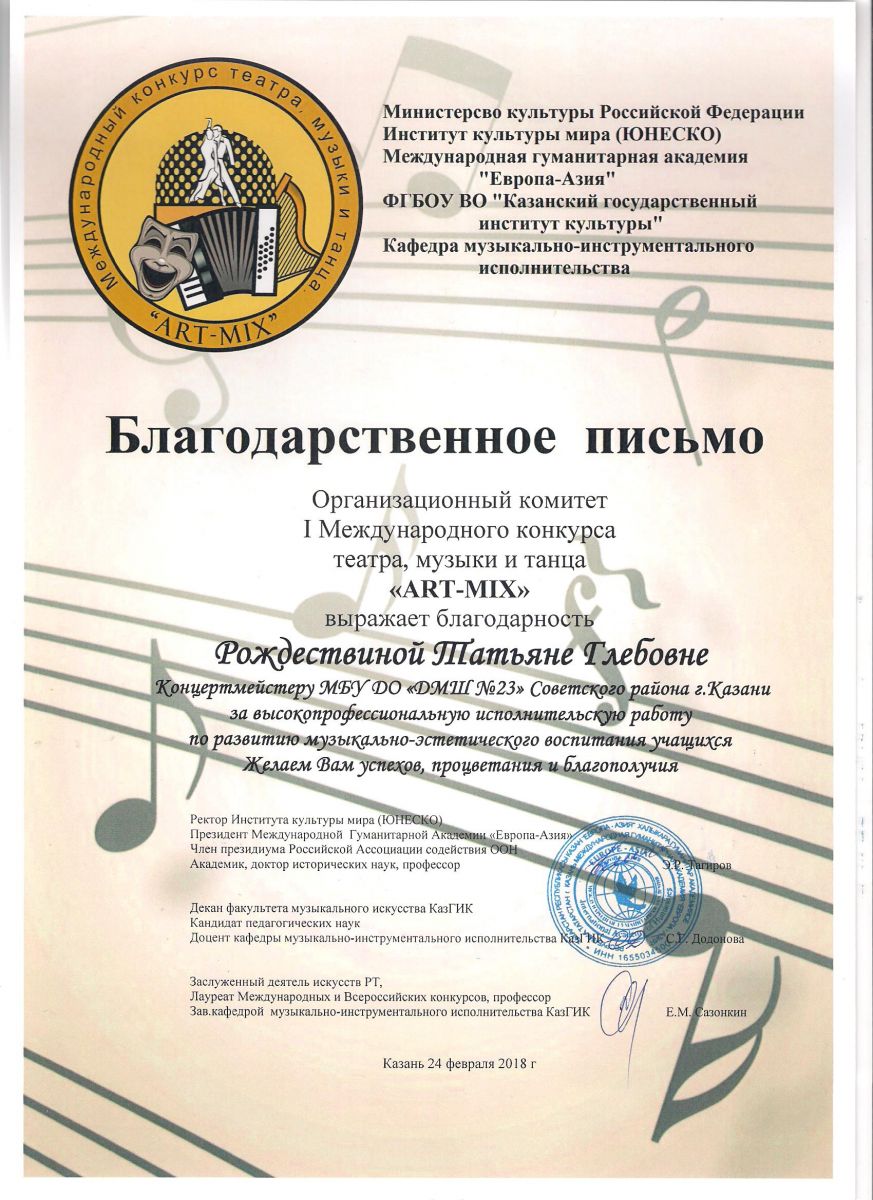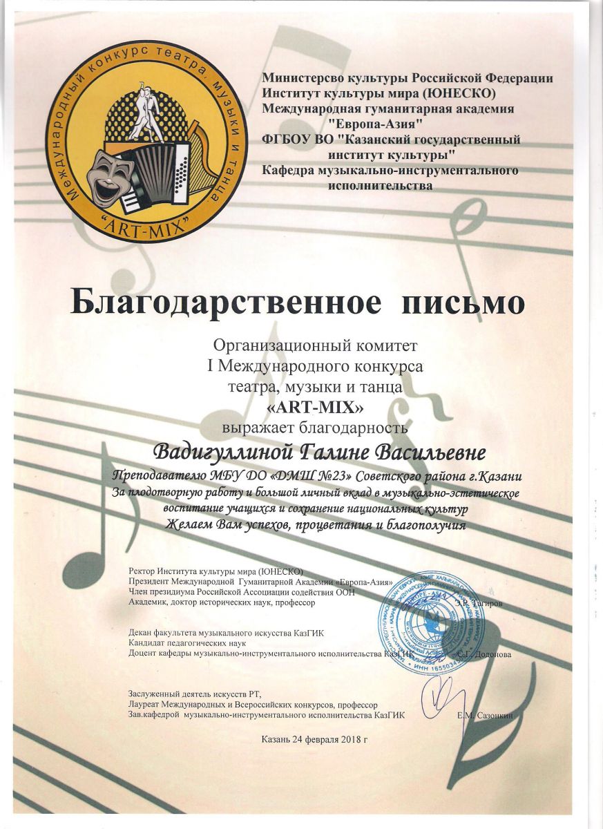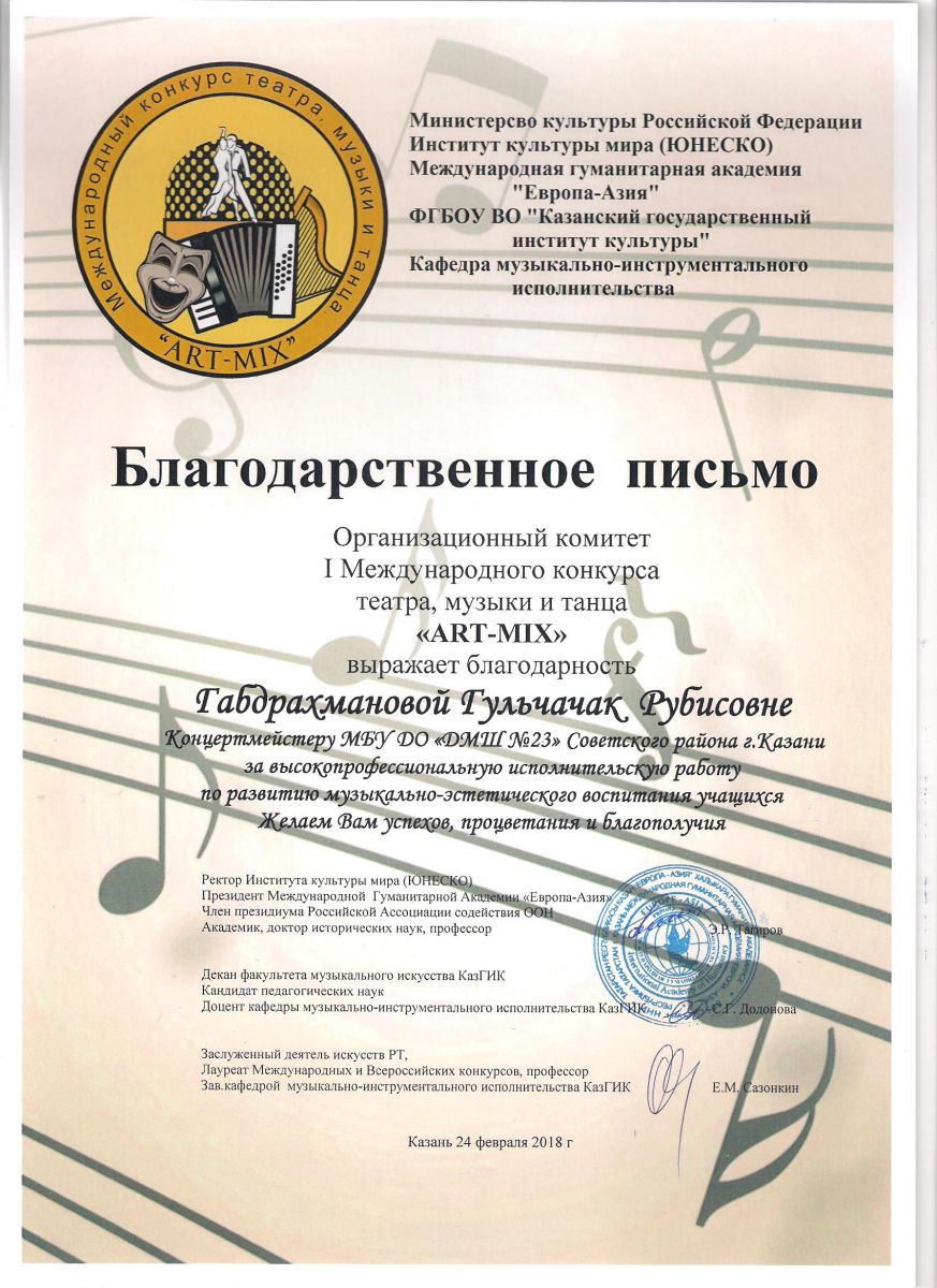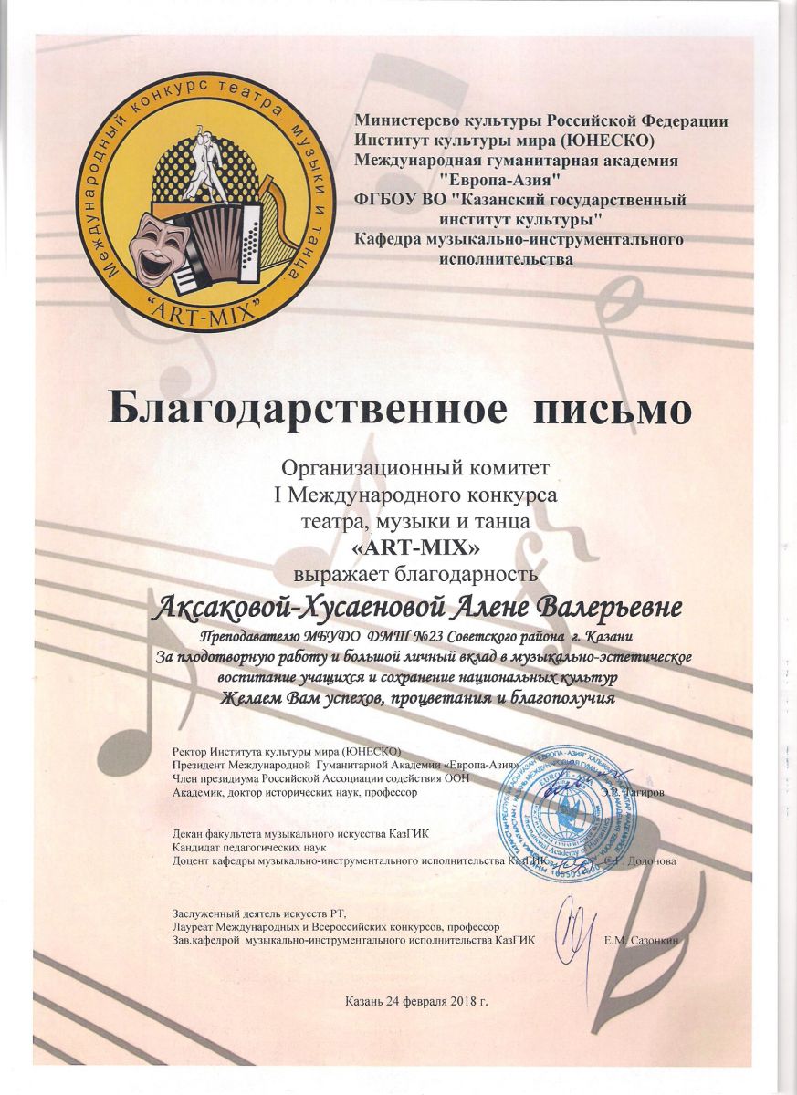 I Международный конкурс театра, музыки и танца "ART-MIX" - Благодарственное письмо - Фахриева Н.М.