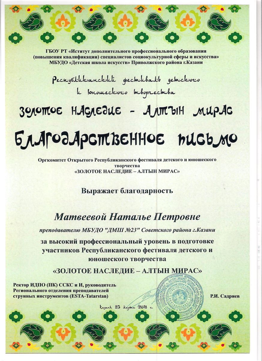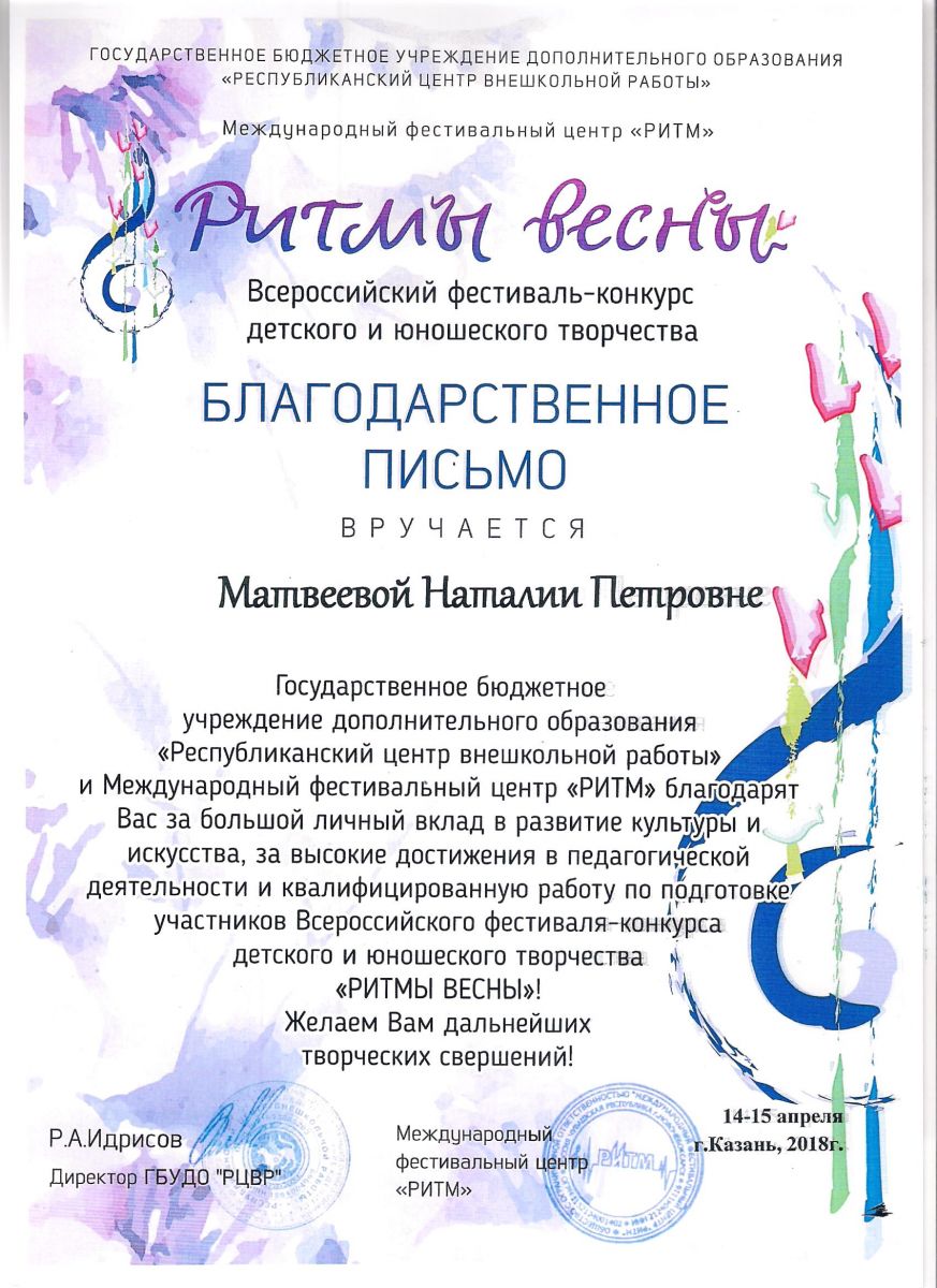 Благодарственное письмо за музыкальную сказку от заведующей МАДОУ №330 - Матвеева Н.П.