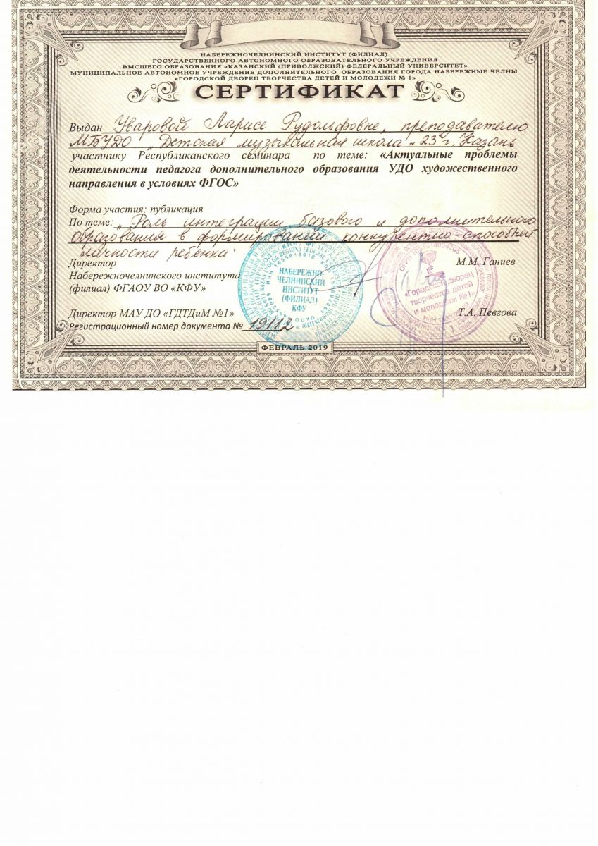 Публикация в сборнике материалов Республиканского семинара - Сертификат - Уварова Л.Р.