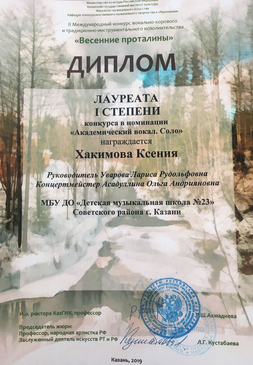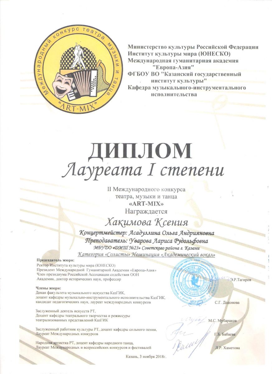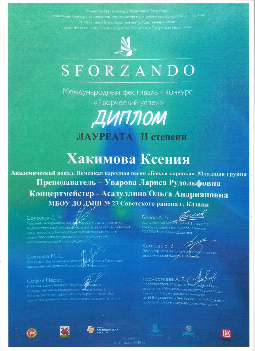 Международный фестиваль-конкурс "Творческий успех" - Диплом лауреата II степени - Хакимова Ксения