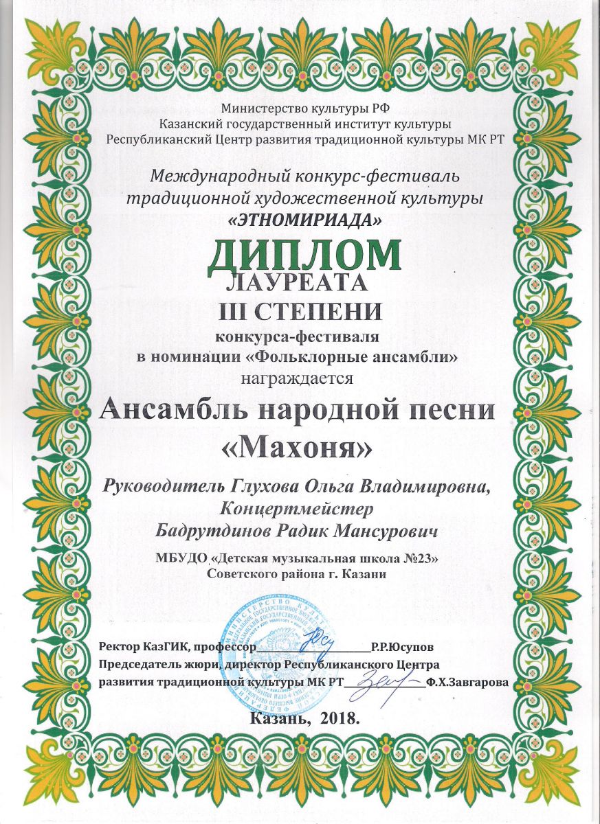 Международный конкурс-фестиваль традиционной художественной культуры "Этномириада" - Диплом лауреата III степени - Ансамбль народной песни "Махоня"