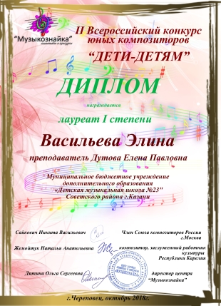 II Всероссийский конкурс юных композиторов "Дети-детям" - Диплом лауреата I степени - Васильева Элина