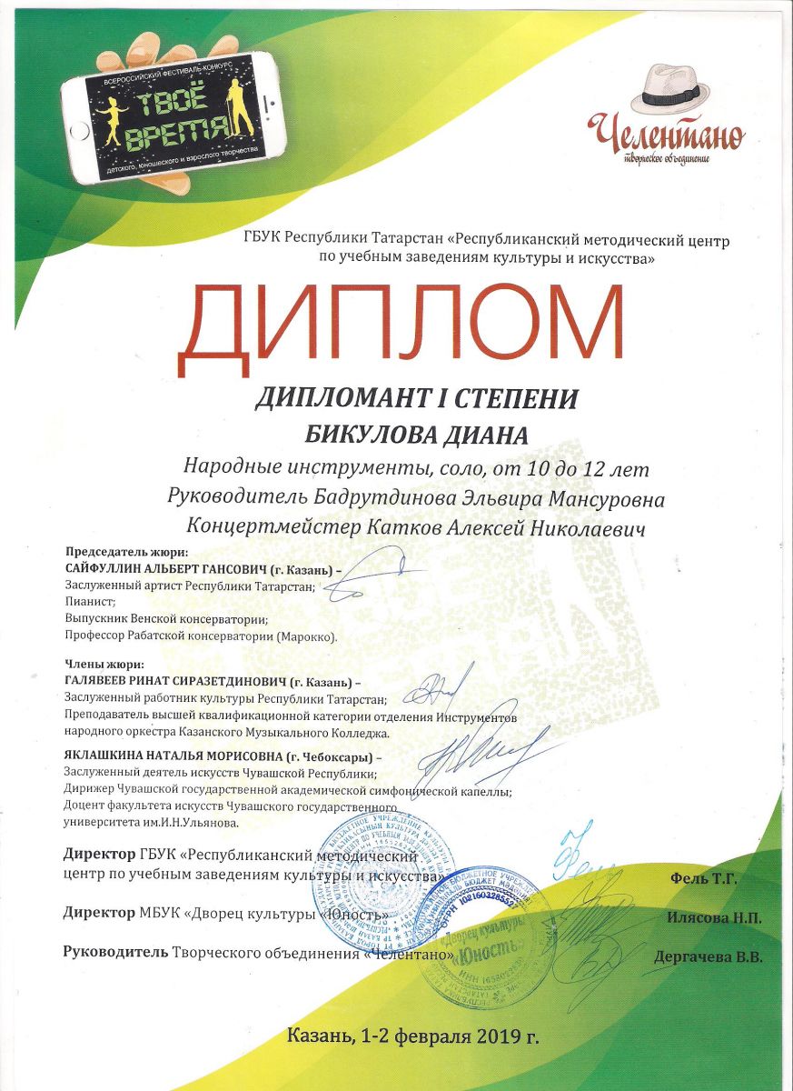 Всероссийский фестиваль-конкурс детского, юношеского и взрослого творчества "Твоё время" - Диплом дипломанта I степени - Бикулова Диана