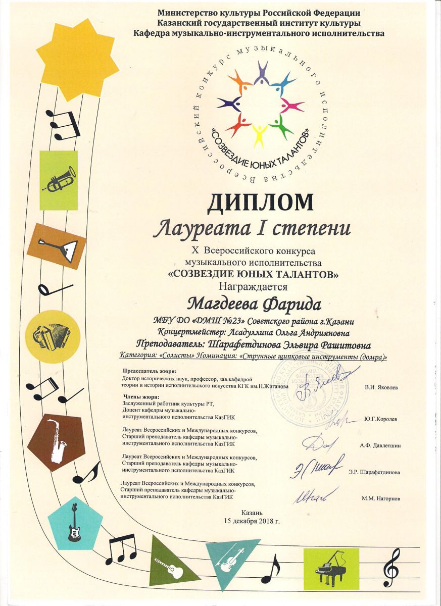 X Всероссийский конкурс музыкального исполнительства "Созвездие юных талантов" - Диплом лауреата I степени - Магдеева Фарида