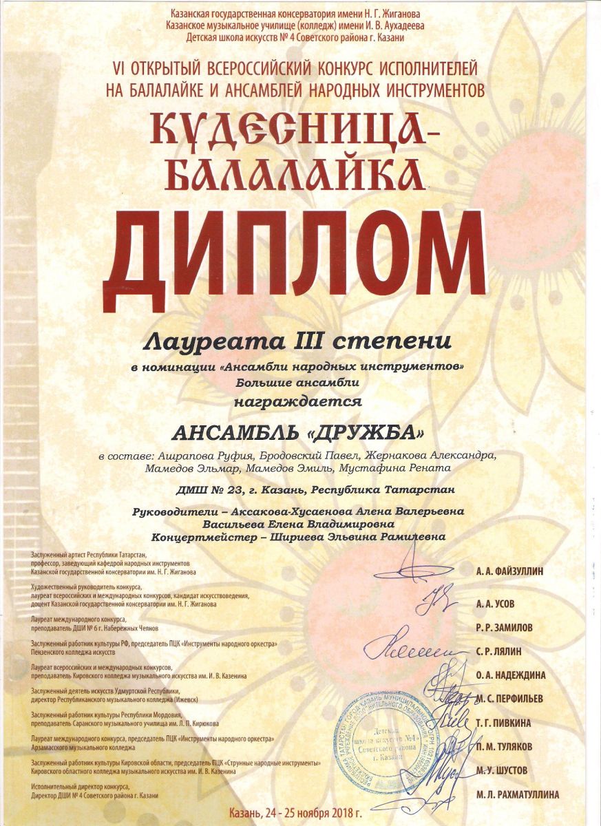VI Открытый Всероссийский конкурс исполнителей на балалайке и ансамблей народных инструментов "Кудесница-балалайка" - Диплом лауреата III степени - Ансамбль "Дружба"