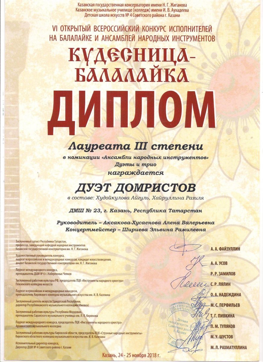 VI Открытый Всероссийский конкурс исполнителей на балалайке и ансамблей народных инструментов "Кудесница-балалайка" - Диплом лауреата III степени - Дуэт домристов: Худойкулова Айгуль, Хайруллина Разиля