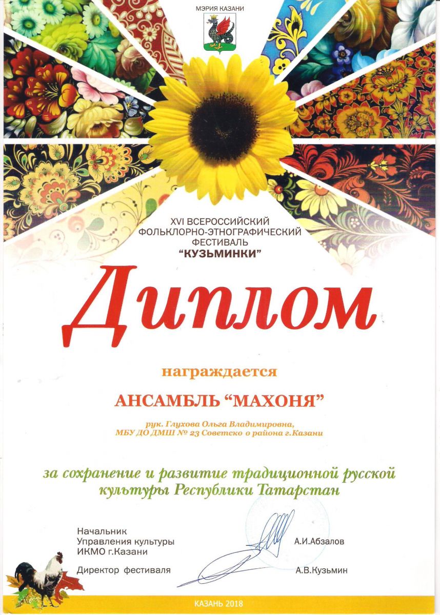 XVI Всероссийский фольклорно-этнографический фестиваль "Кузьминки" - Диплом - Ансамбль "Махоня"