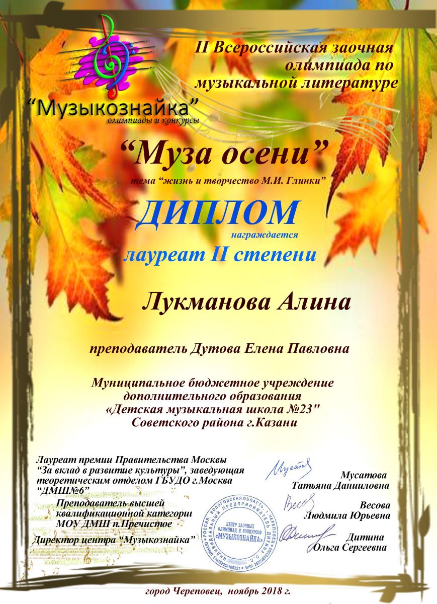 II Всероссийская заочная олимпиада по музыкальной литературе "Муза осени" - Диплом лауреата II степени - Лукманова Алина
