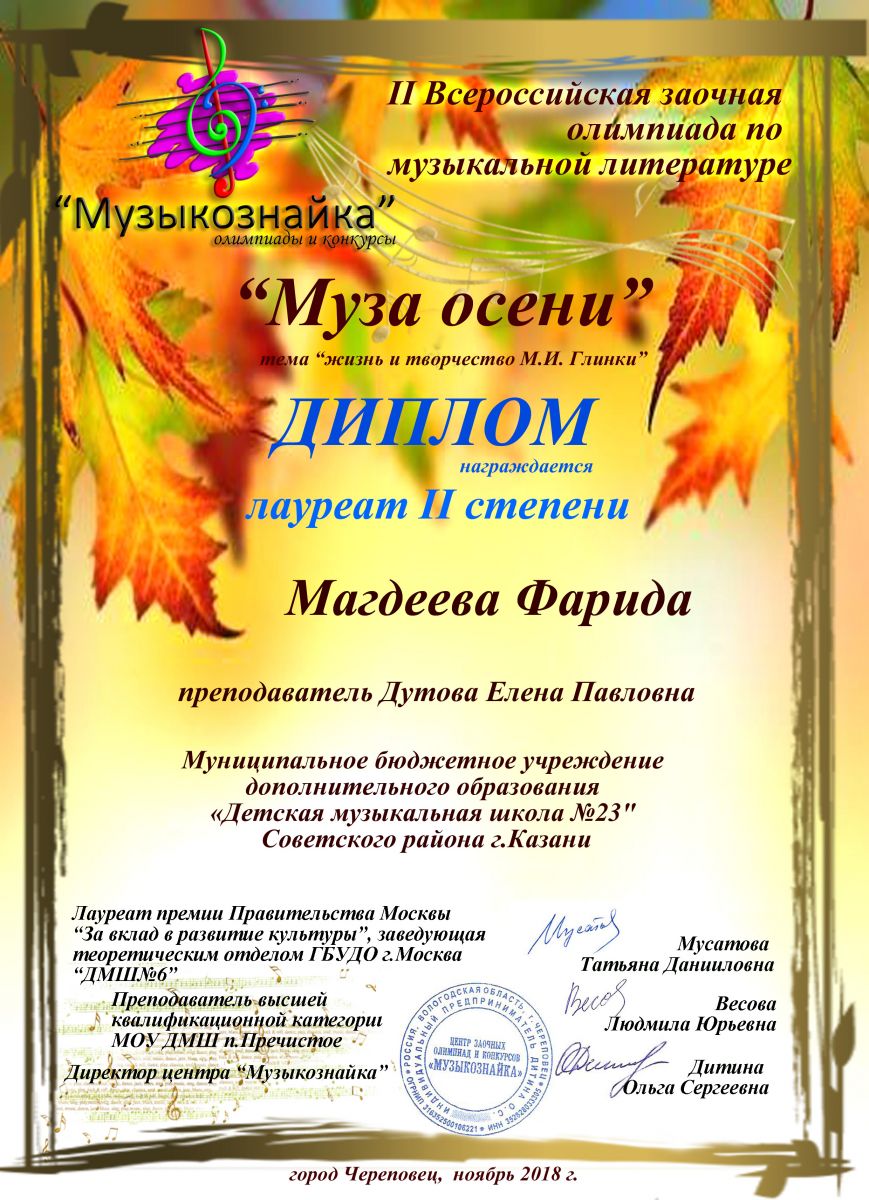 II Всероссийская заочная олимпиада по музыкальной литературе "Муза осени" - Диплом лауреата II степени - Магдеева Фарида