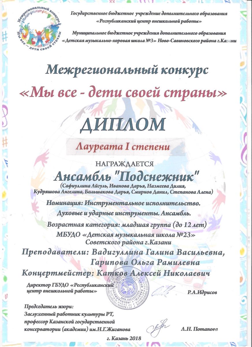 Межрегиональный конкурс "Мы все - дети своей страны" - Диплом лауреата I степени - Ансамбль "Подснежник"