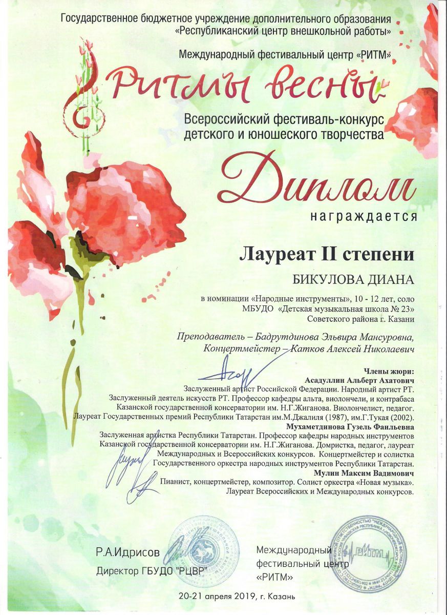 Всероссийский фестиваль-конкурс детского и юношеского творчества "Ритмы весны" - Диплом лауреата II степени - Бикулова Диана