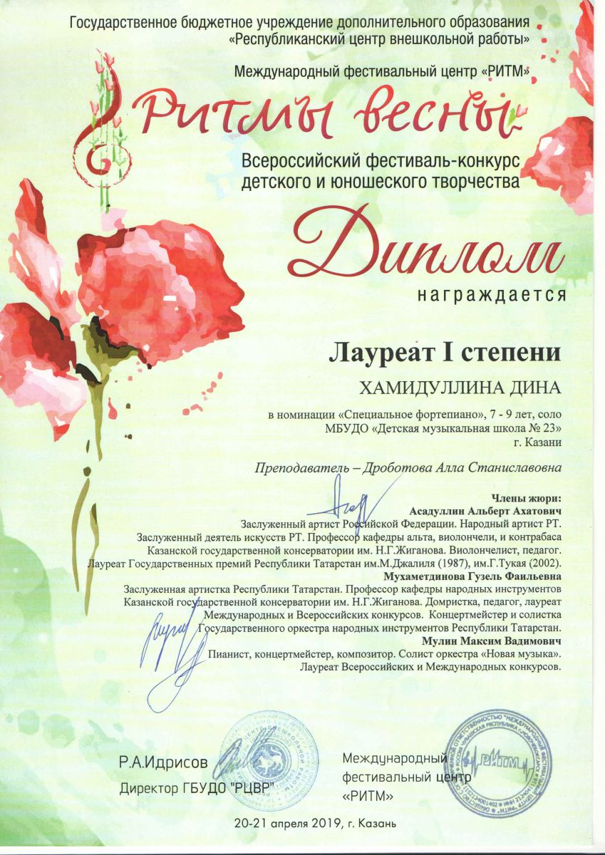 Всероссийский фестиваль-конкурс детского и юношеского творчества "Ритмы весны" - Диплом лауреата I степени - Хамидуллина Дина