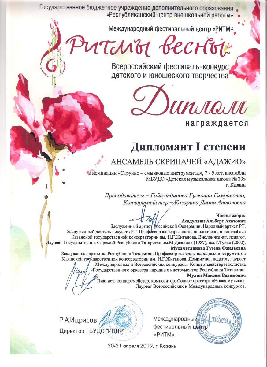 Всероссийский фестиваль-конкурс детского и юношеского творчества "Ритмы весны" - Диплом дипломанта I степени - Ансамбль скрипачей "Адажио"