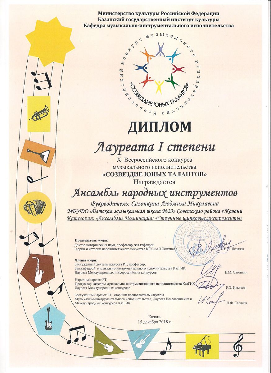 X Всероссийский конкурс музыкального исполнительства "Созвездие юных талантов" - Диплом лауреата I степени - Ансамбль народных инструментов