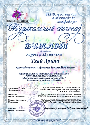 III Всероссийская олимпиада по сольфеджио "Музыкальный снегопад" - Диплом лауреата II степени - Тхай Арина