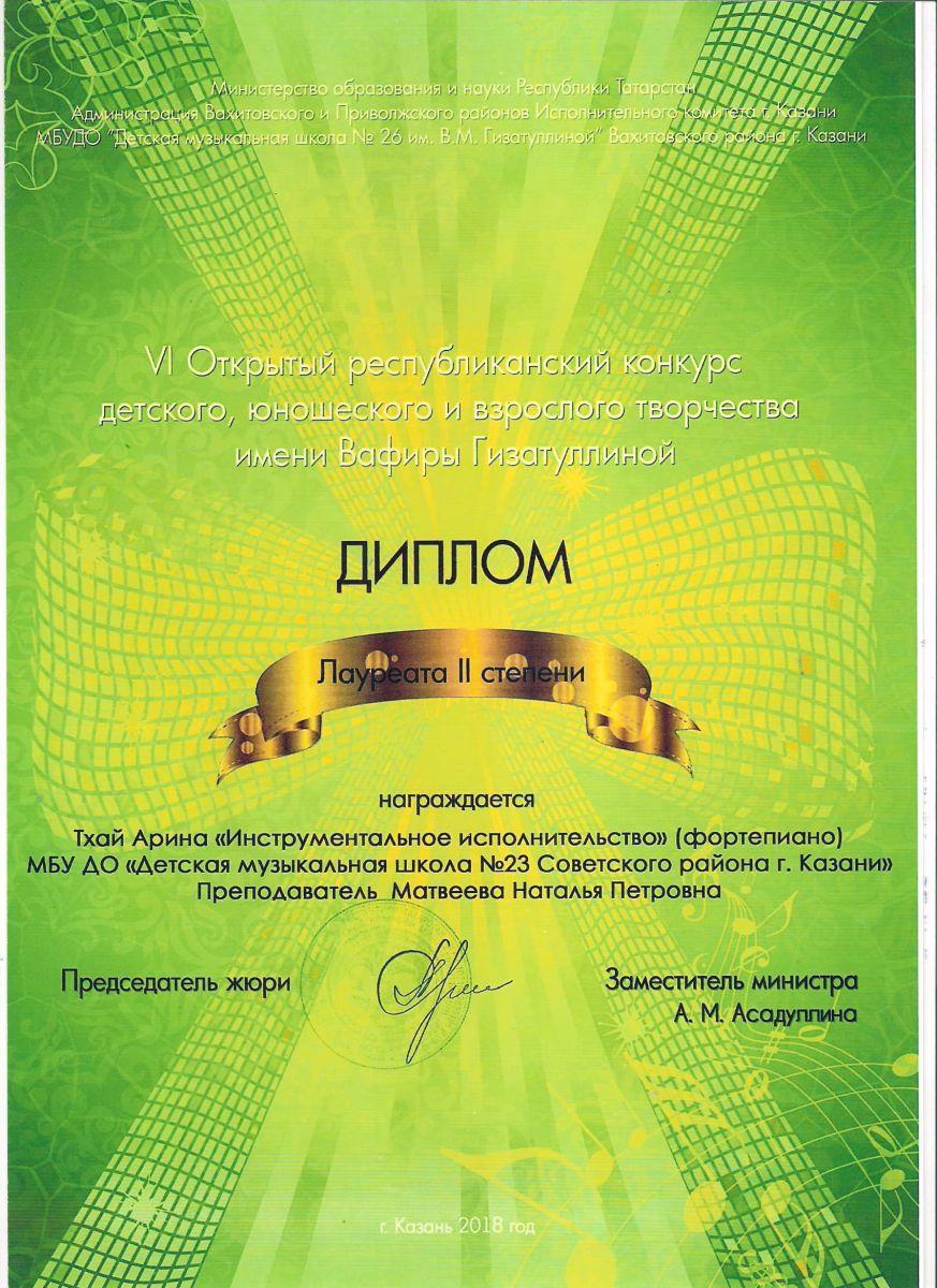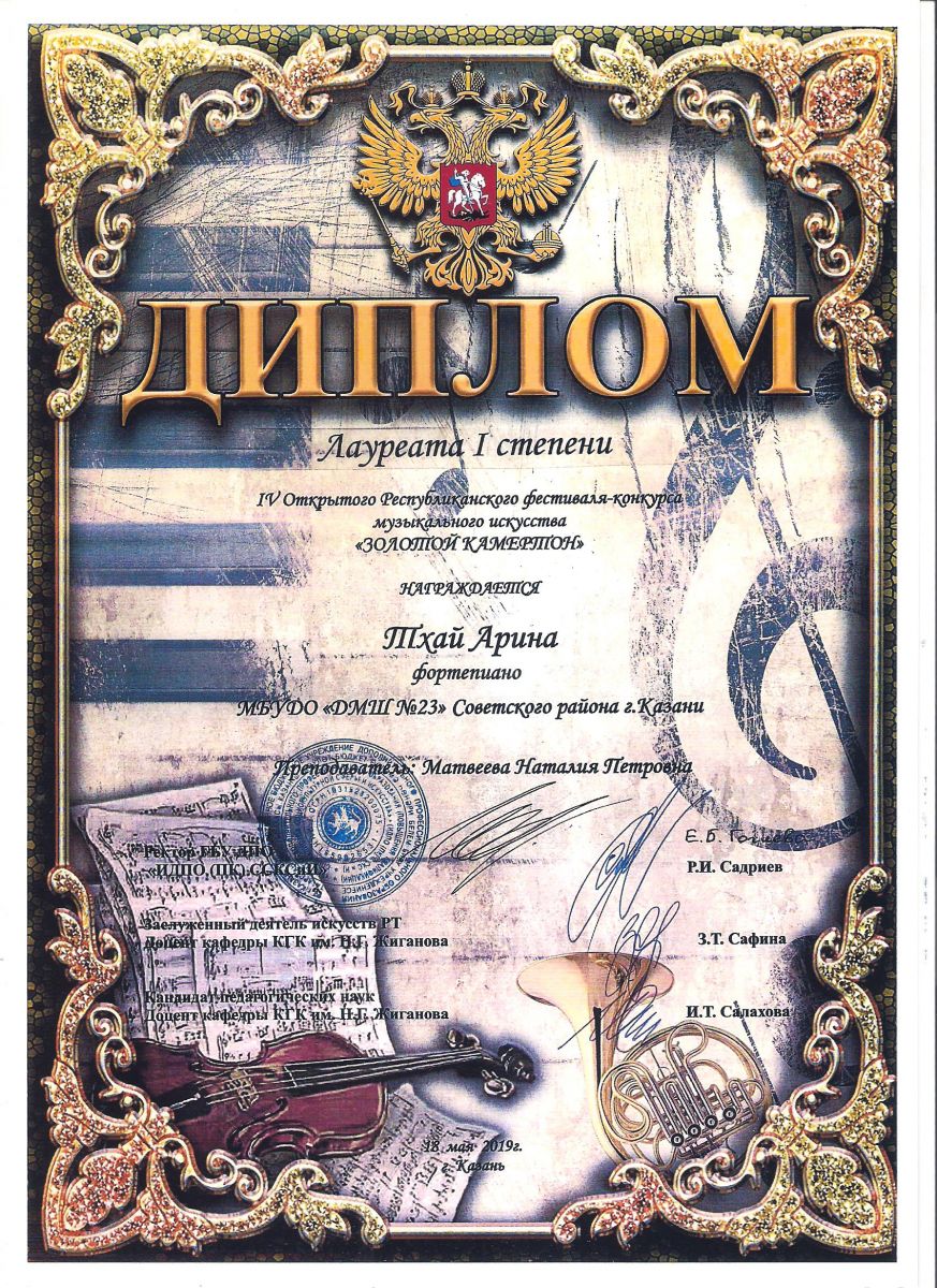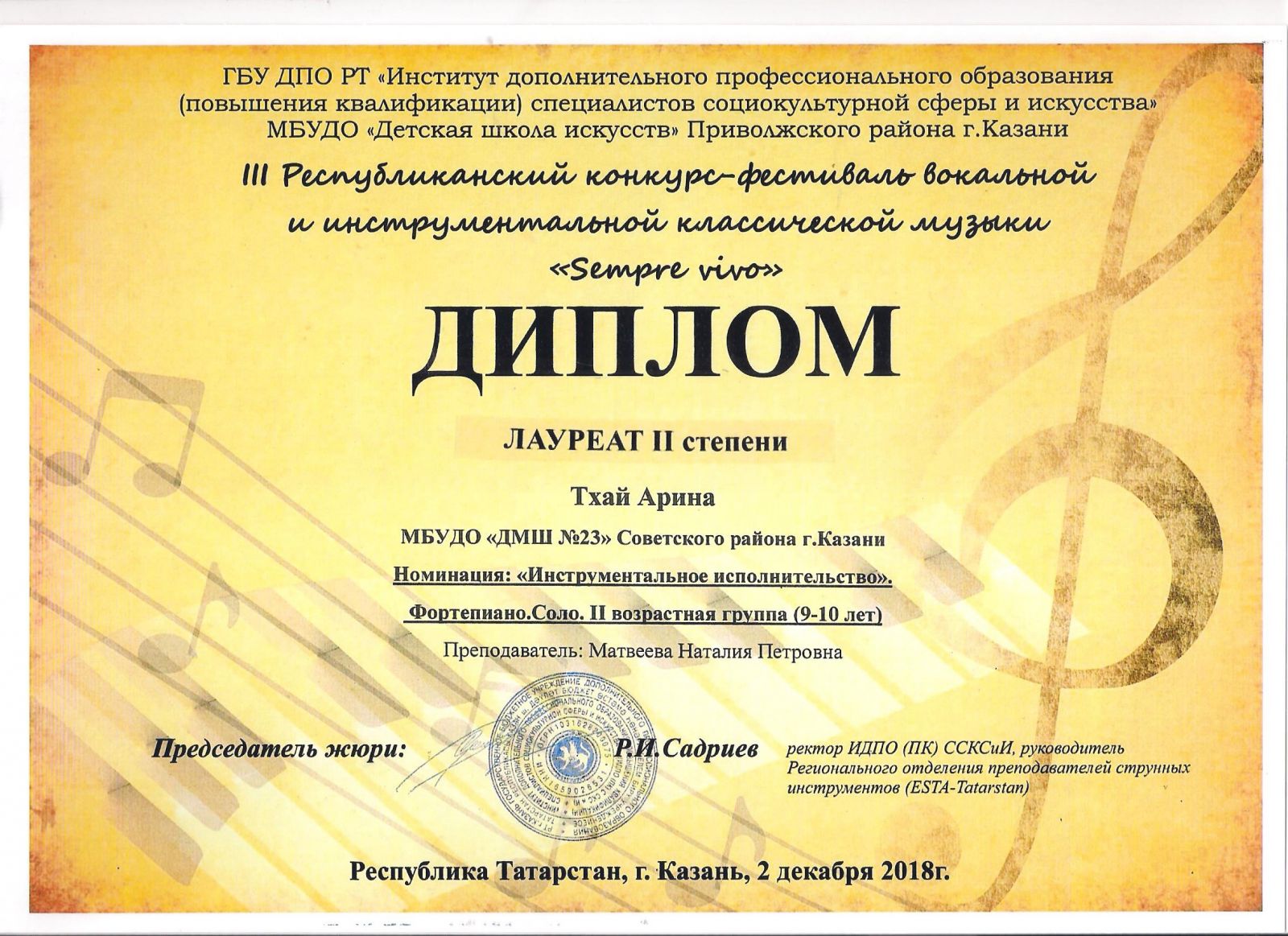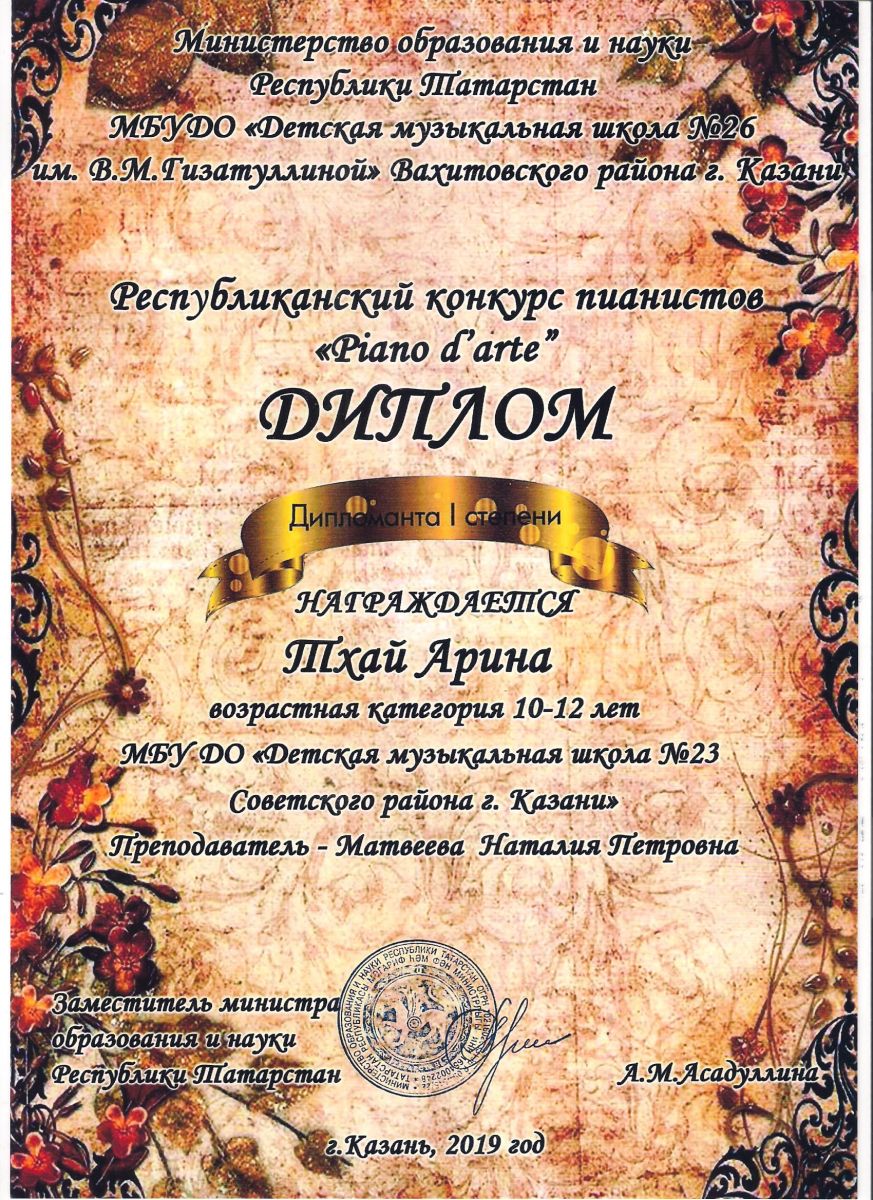 Республиканский конкурс пианистов "Piano d'arte" - Диплом дипломанта I степени - Тхай Арина