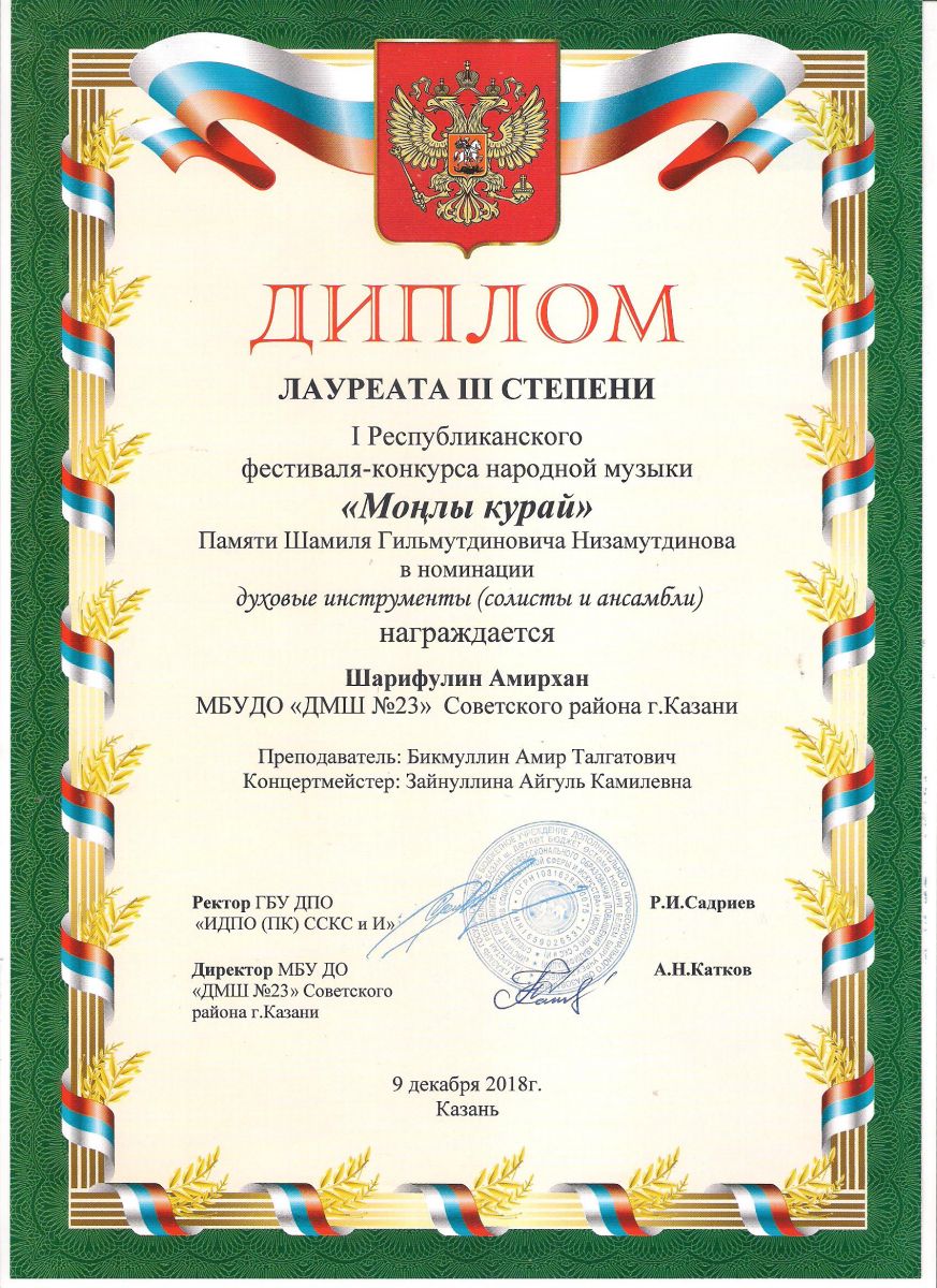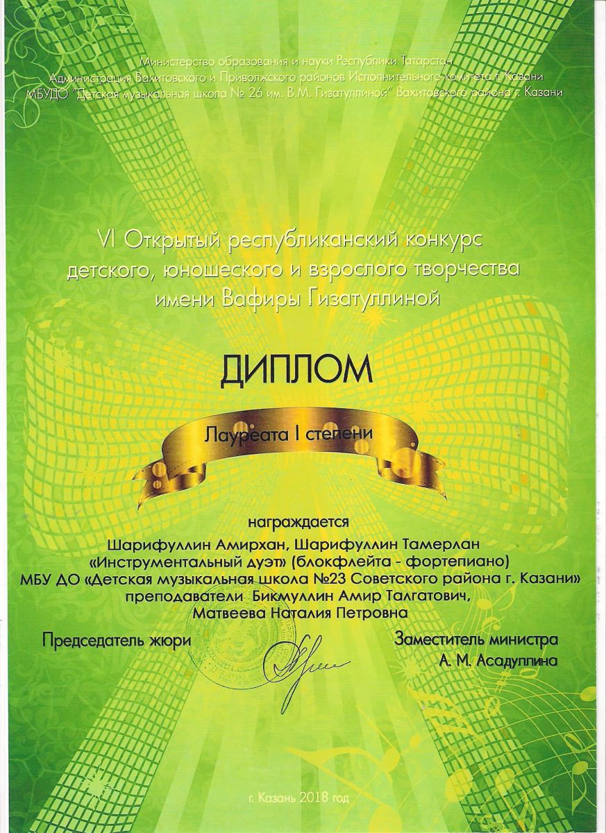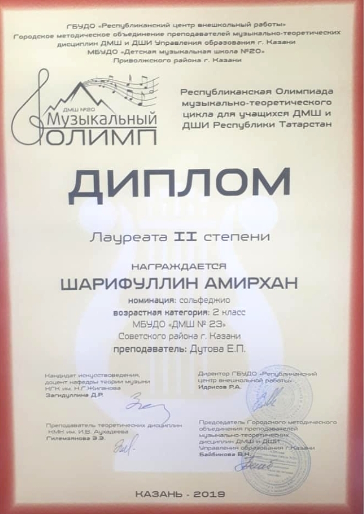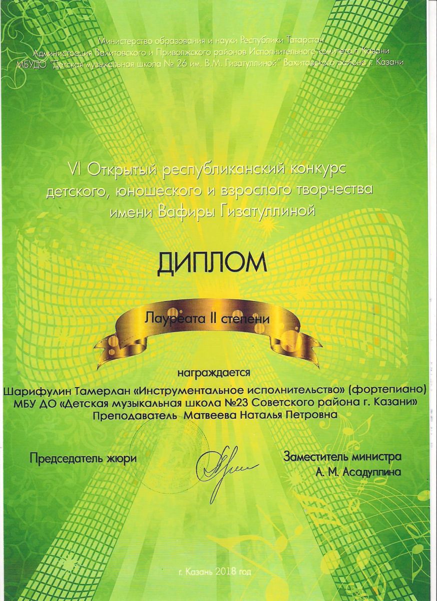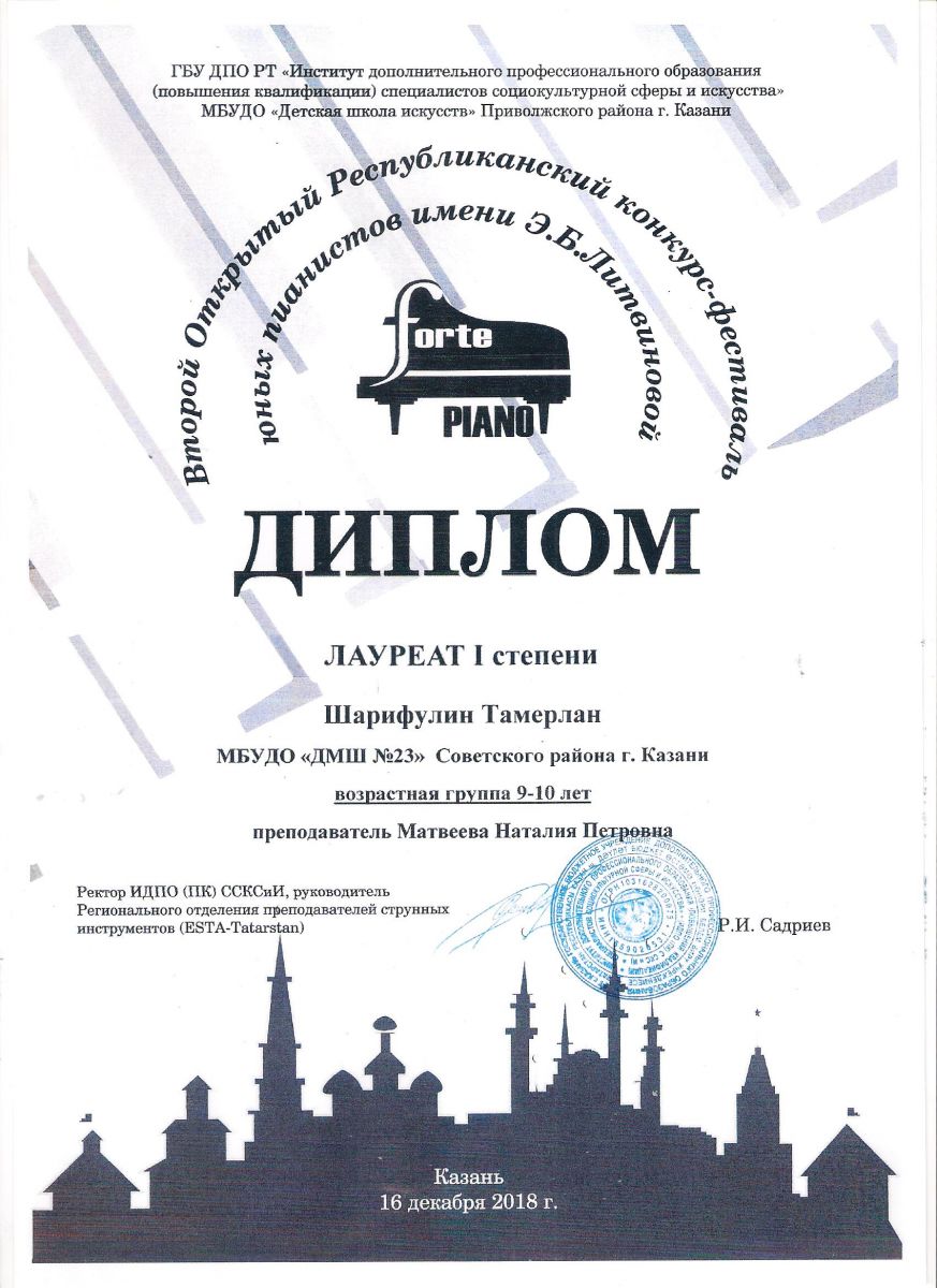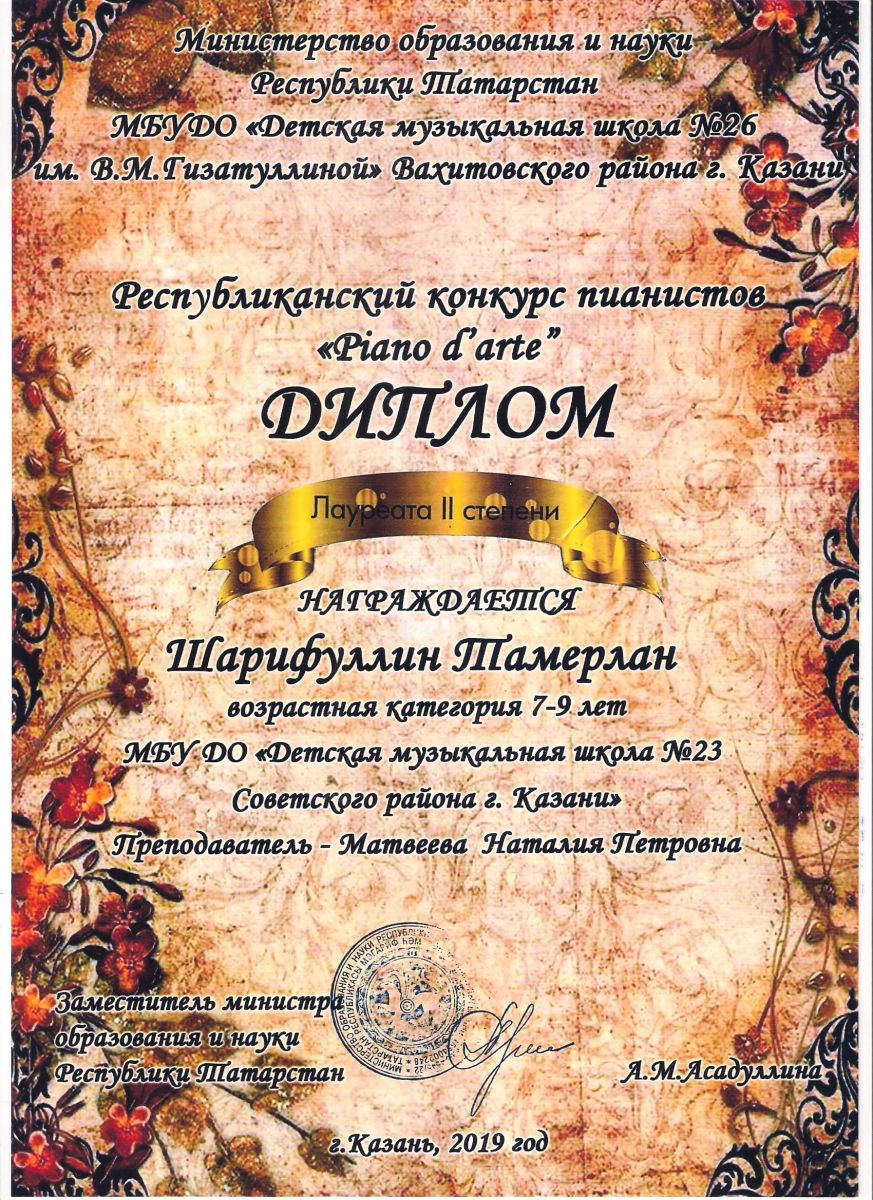 Республиканский конкурс пианистов "Piano d'arte" - Диплом лауреата II степени - Шарифулин Тамерлан