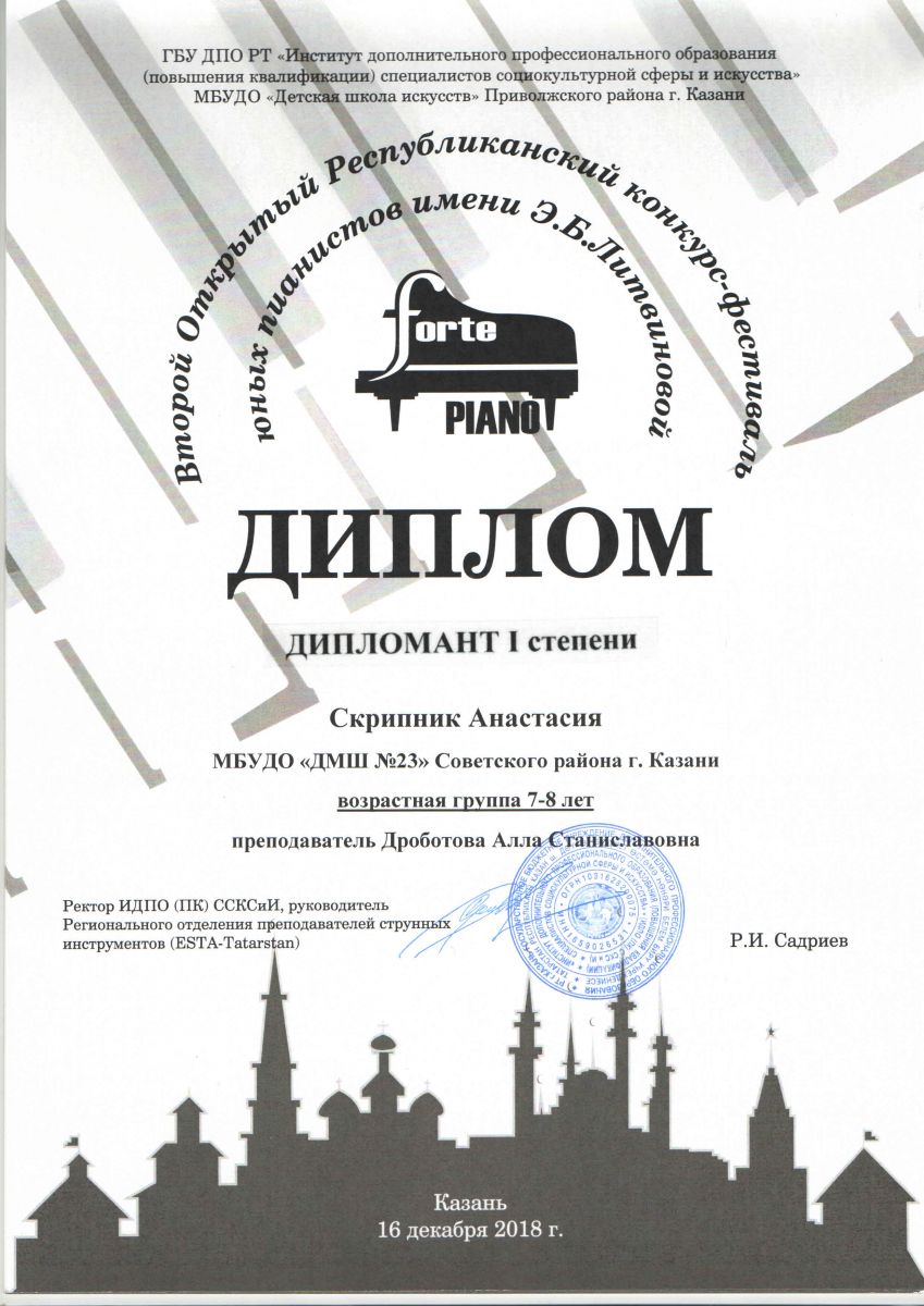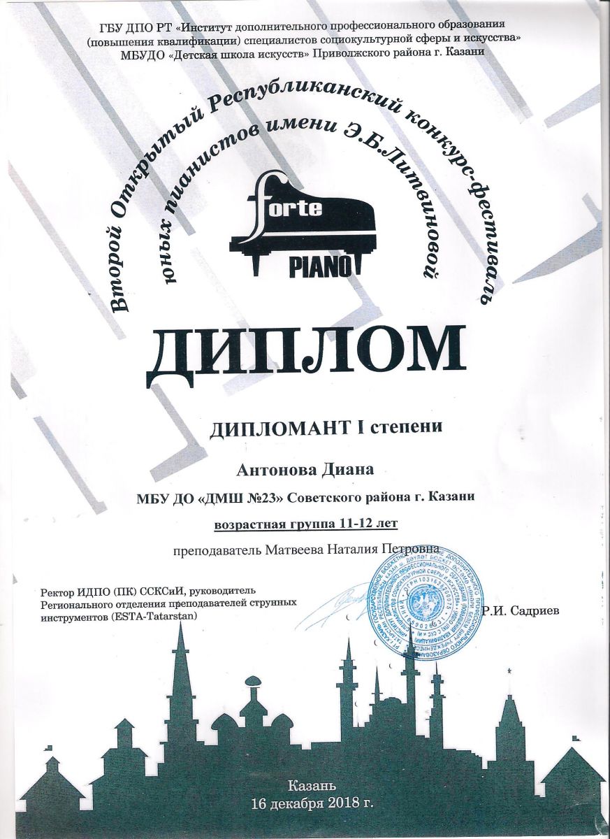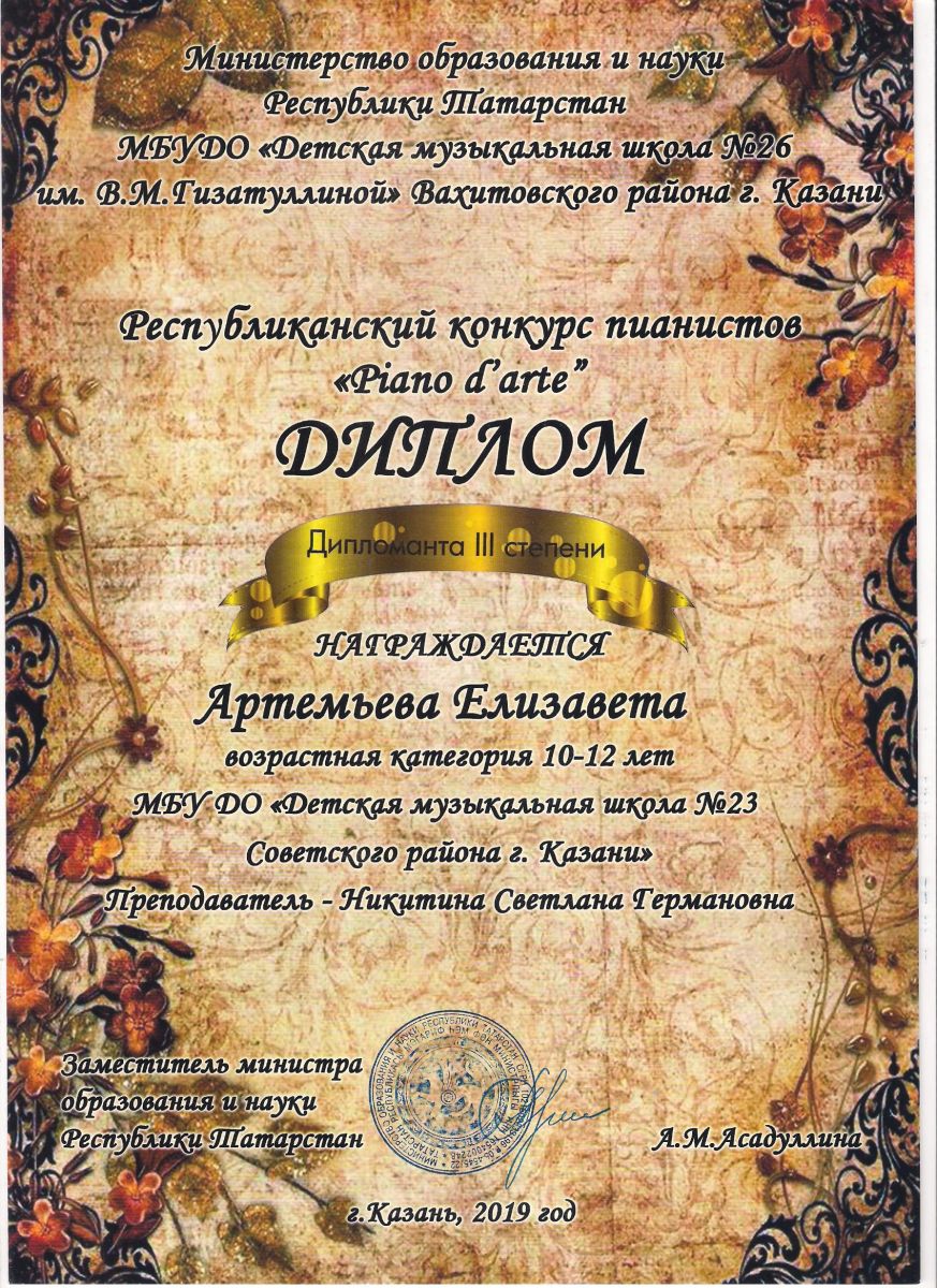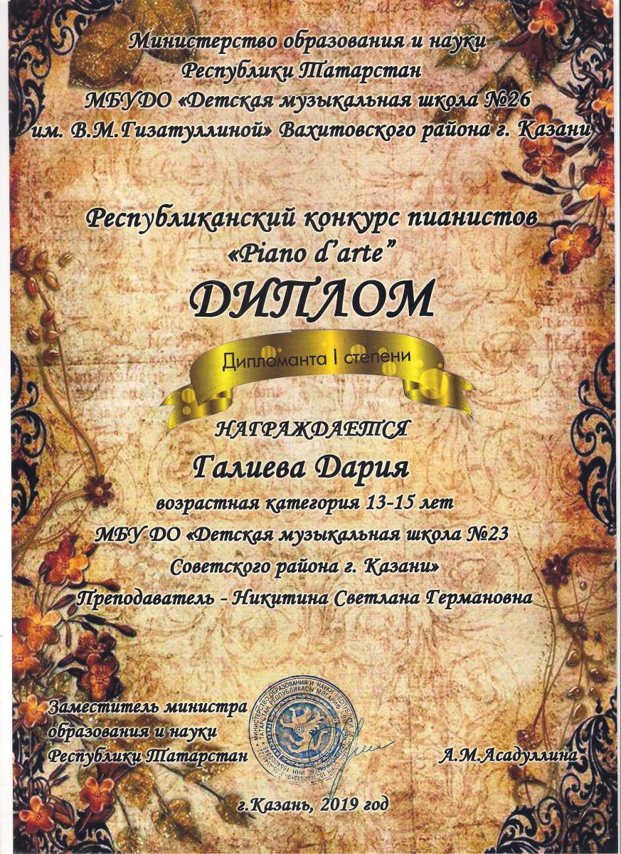 Республиканский конкурс пианистов "Piano d'arte" - Диплом дипломанта I степени - Галиева Дария