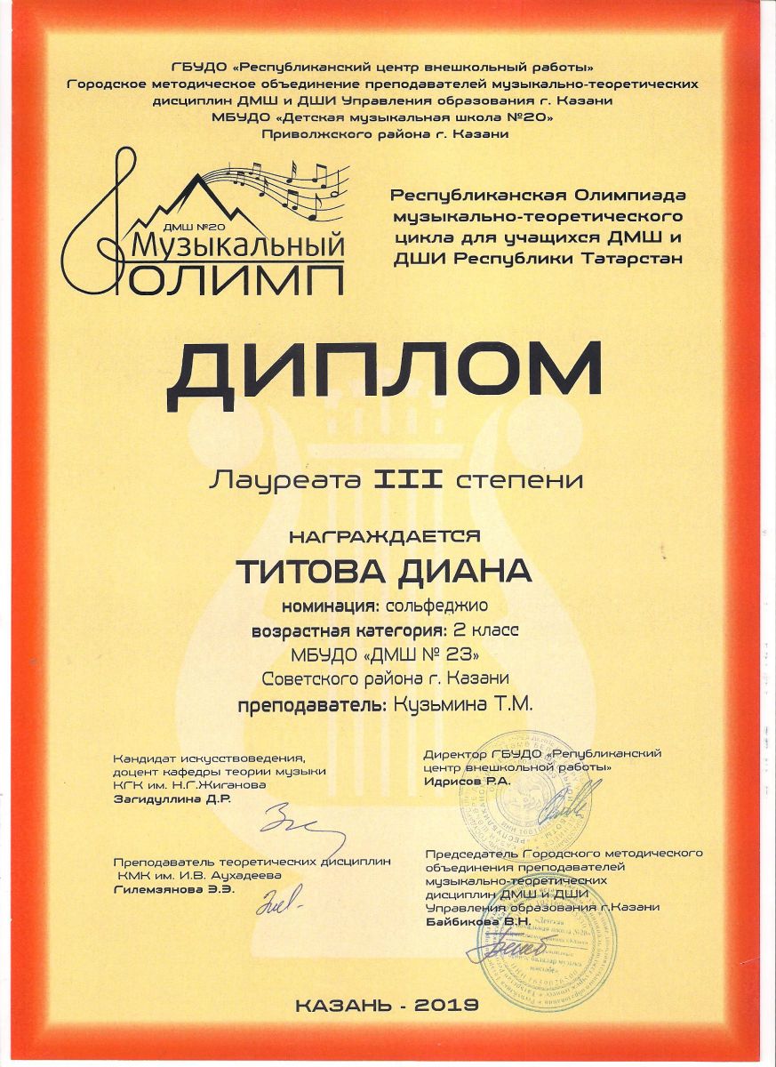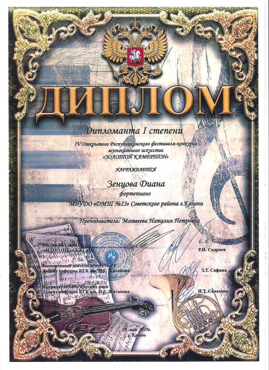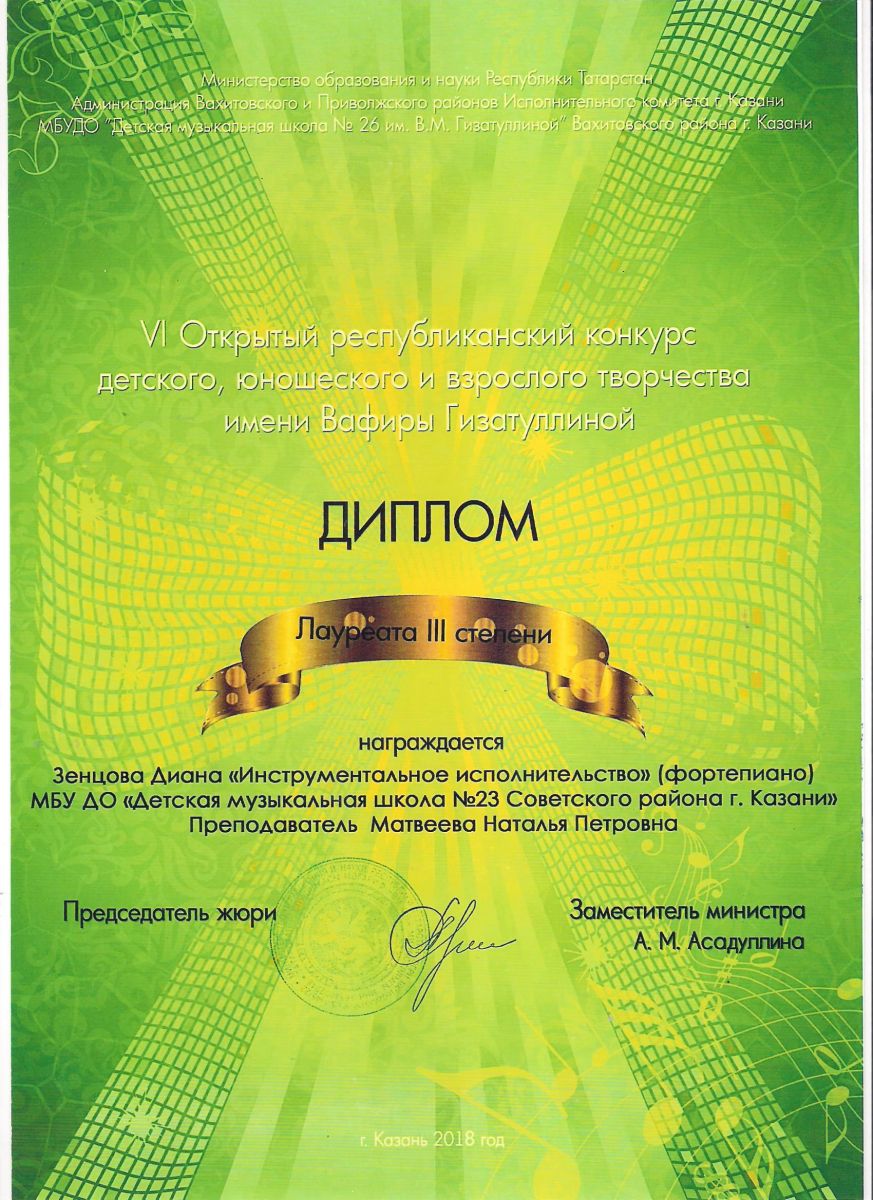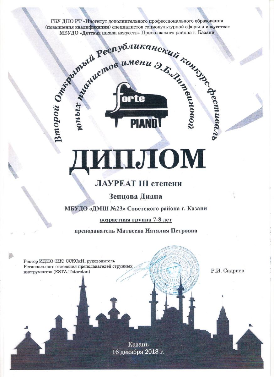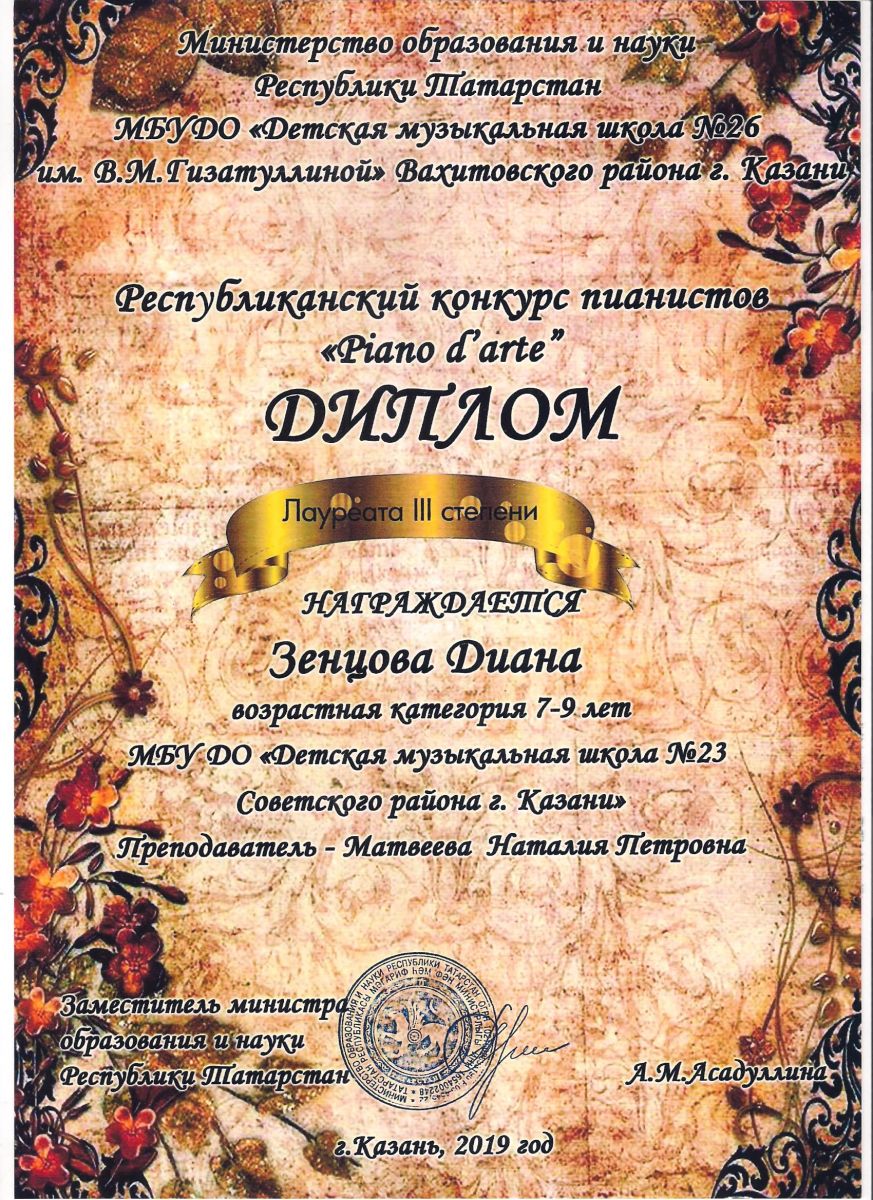 Республиканский конкурс пианистов "Piano d'arte" - Диплом лауреата III степени - Зенцова Диана