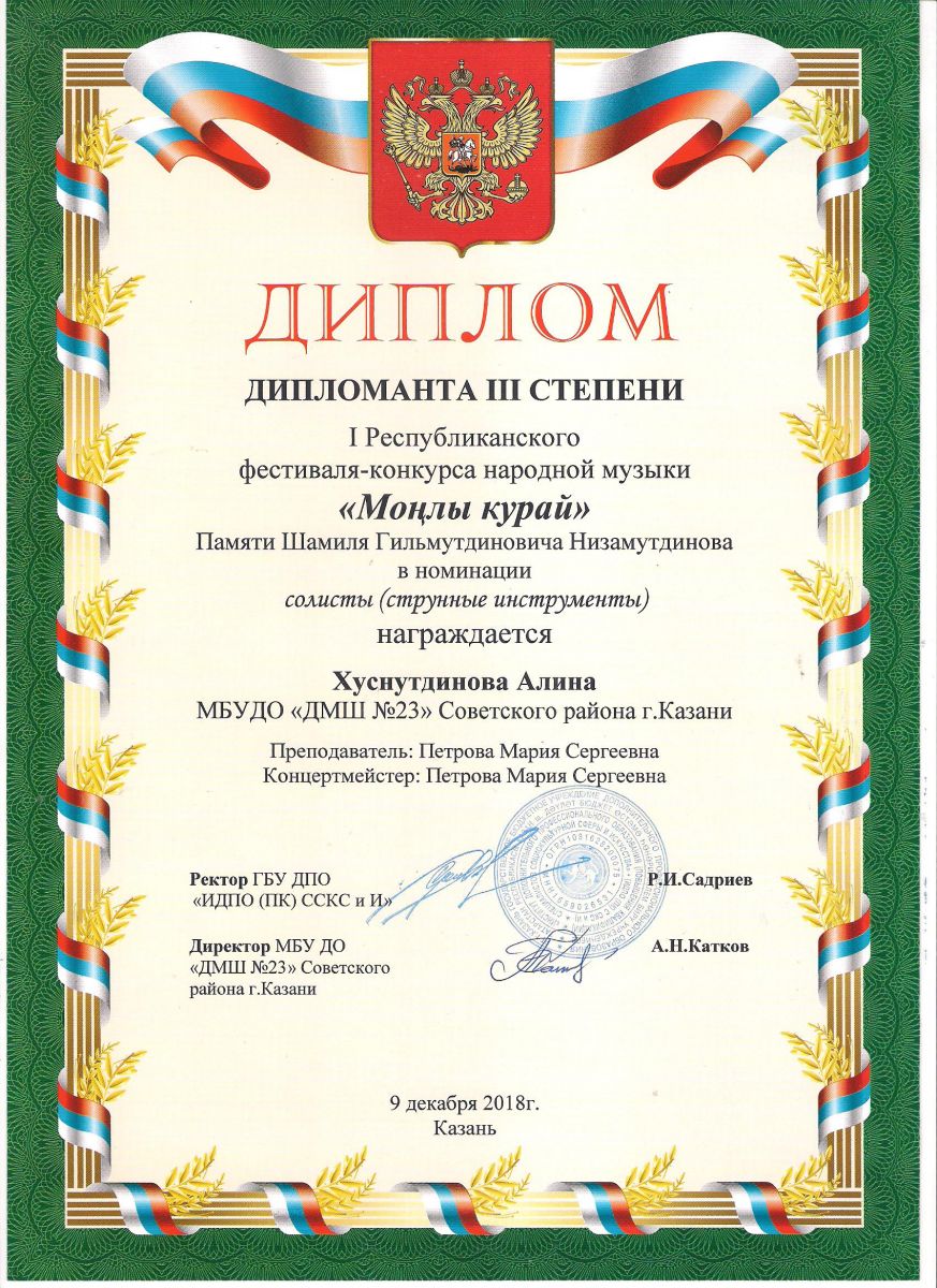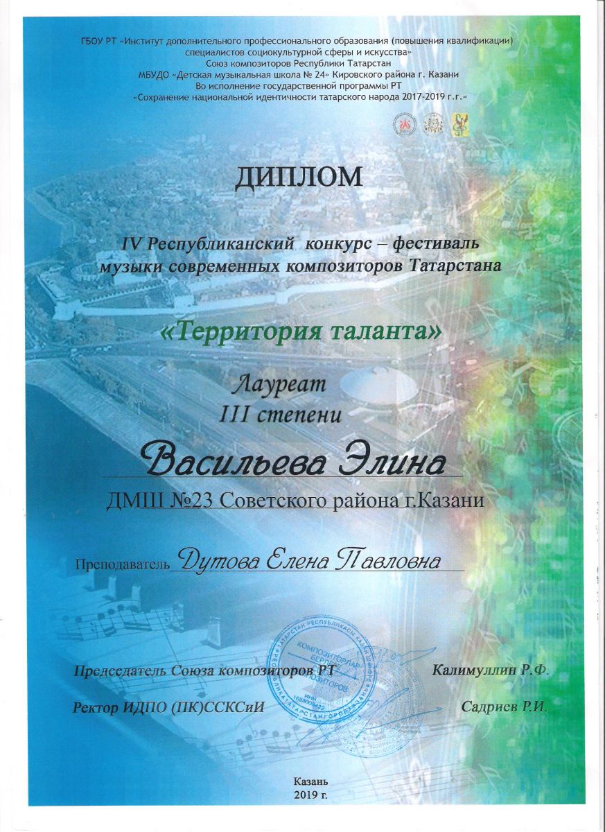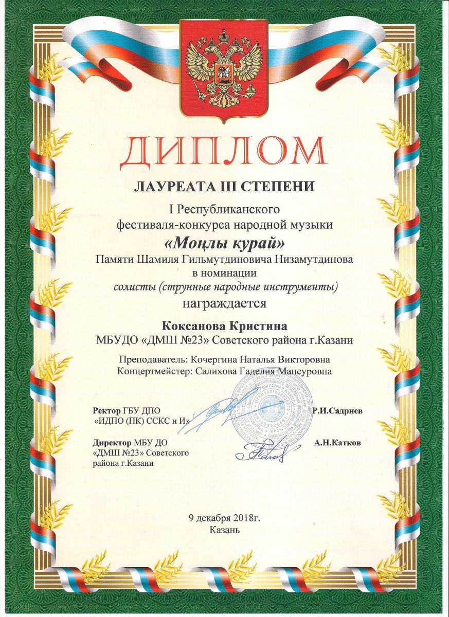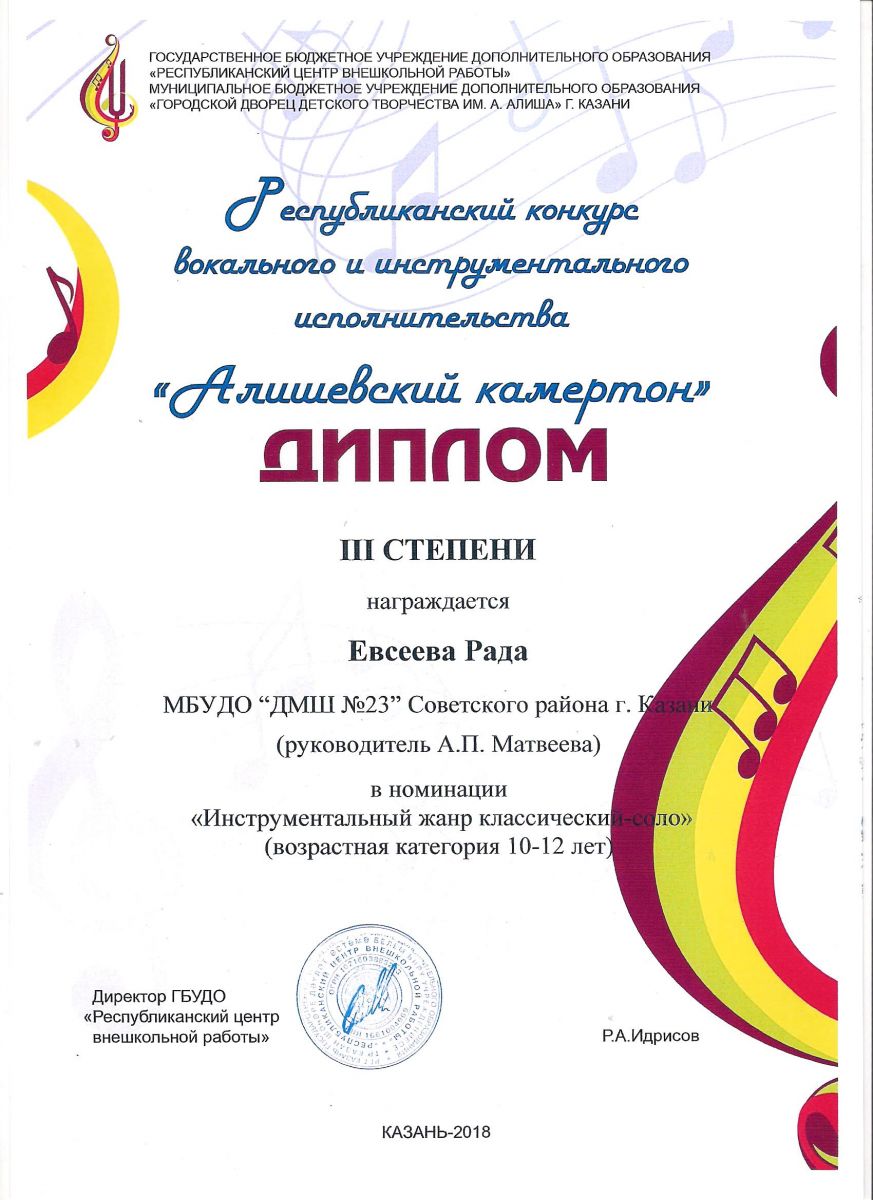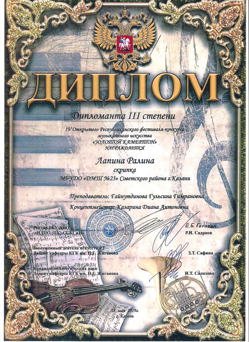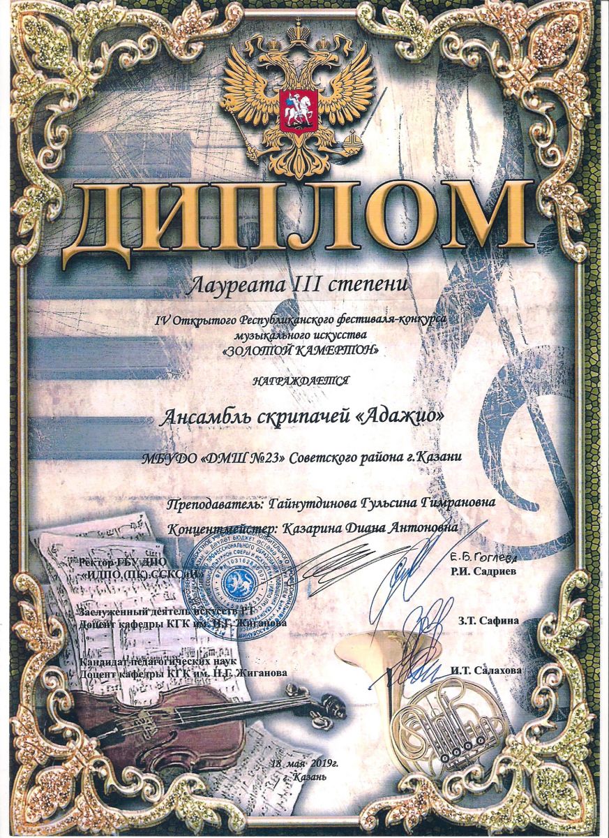 Республиканский конкурс пианистов "Piano d'arte" - Диплом лауреата III степени - Зенцова Диана