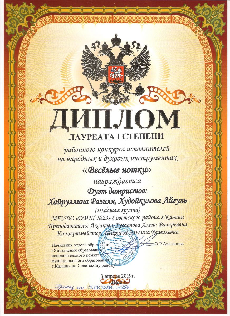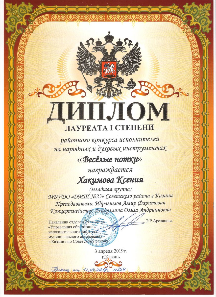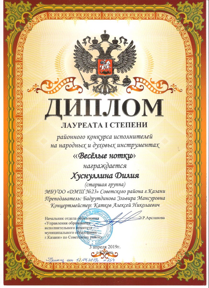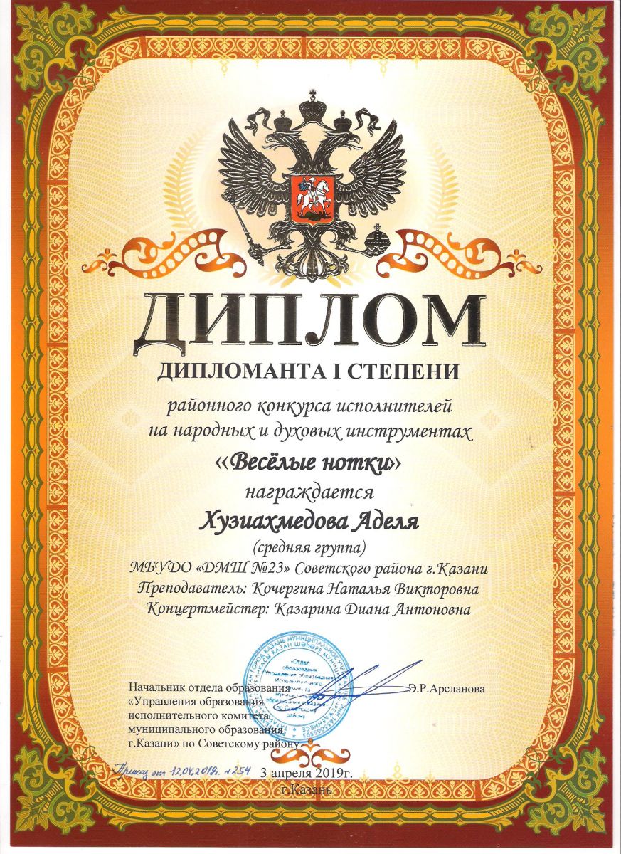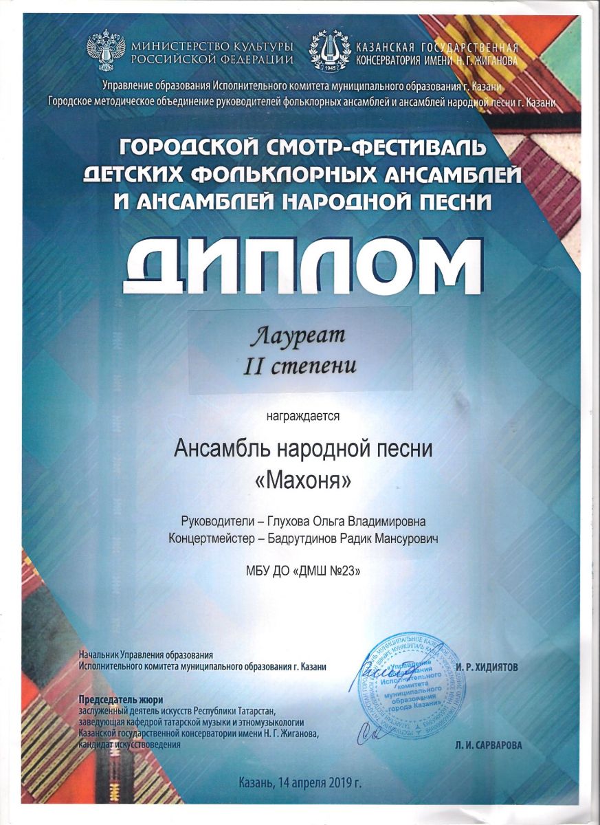 Городской конкурс татарской музыки «Кояшлы бүләк - 2019» - Диплом лауреата I степени - Тхай Арина