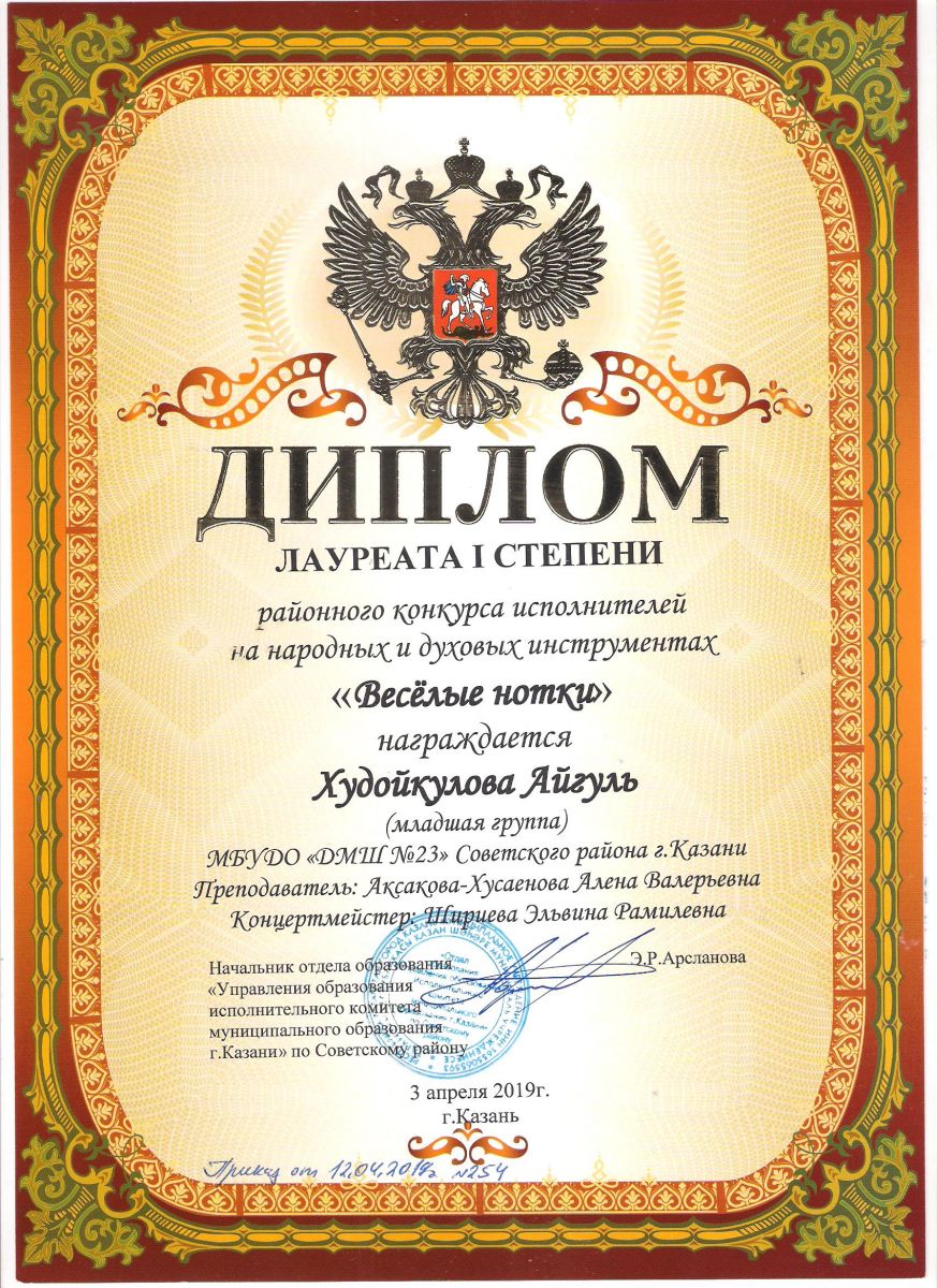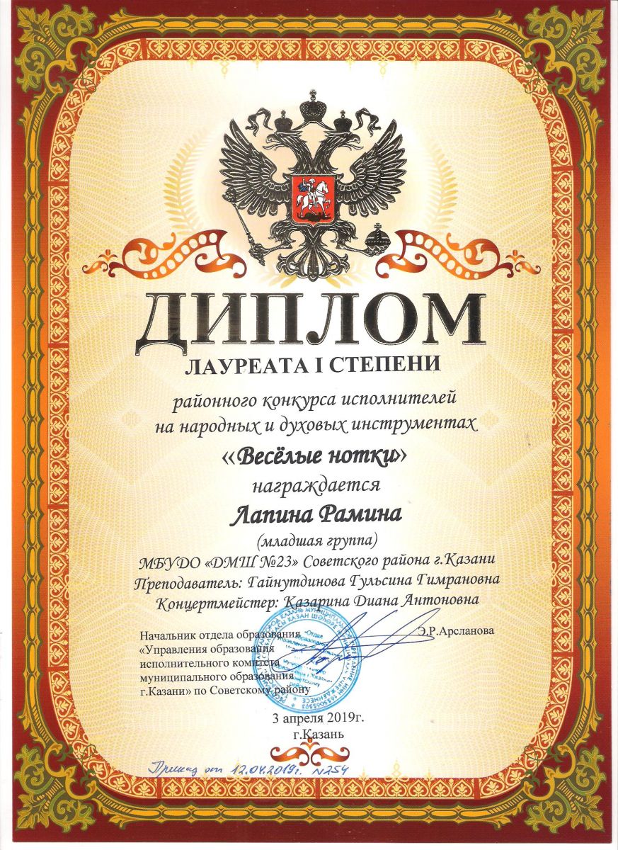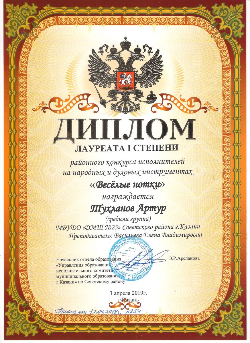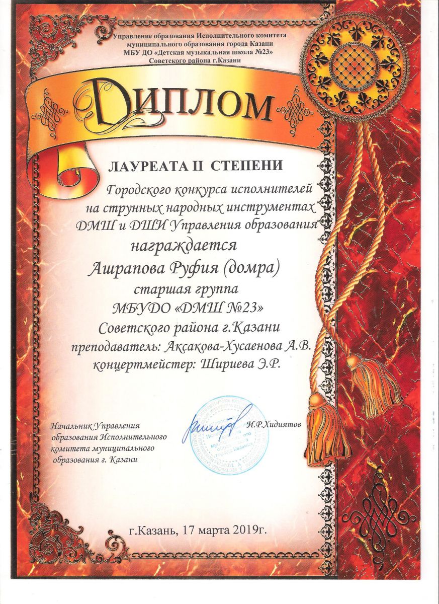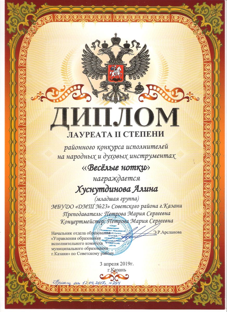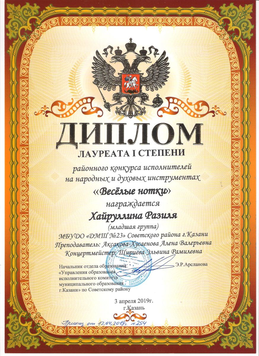 Городской конкурс татарской музыки «Кояшлы бүләк - 2019» - Диплом лауреата I степени - Тхай Арина
