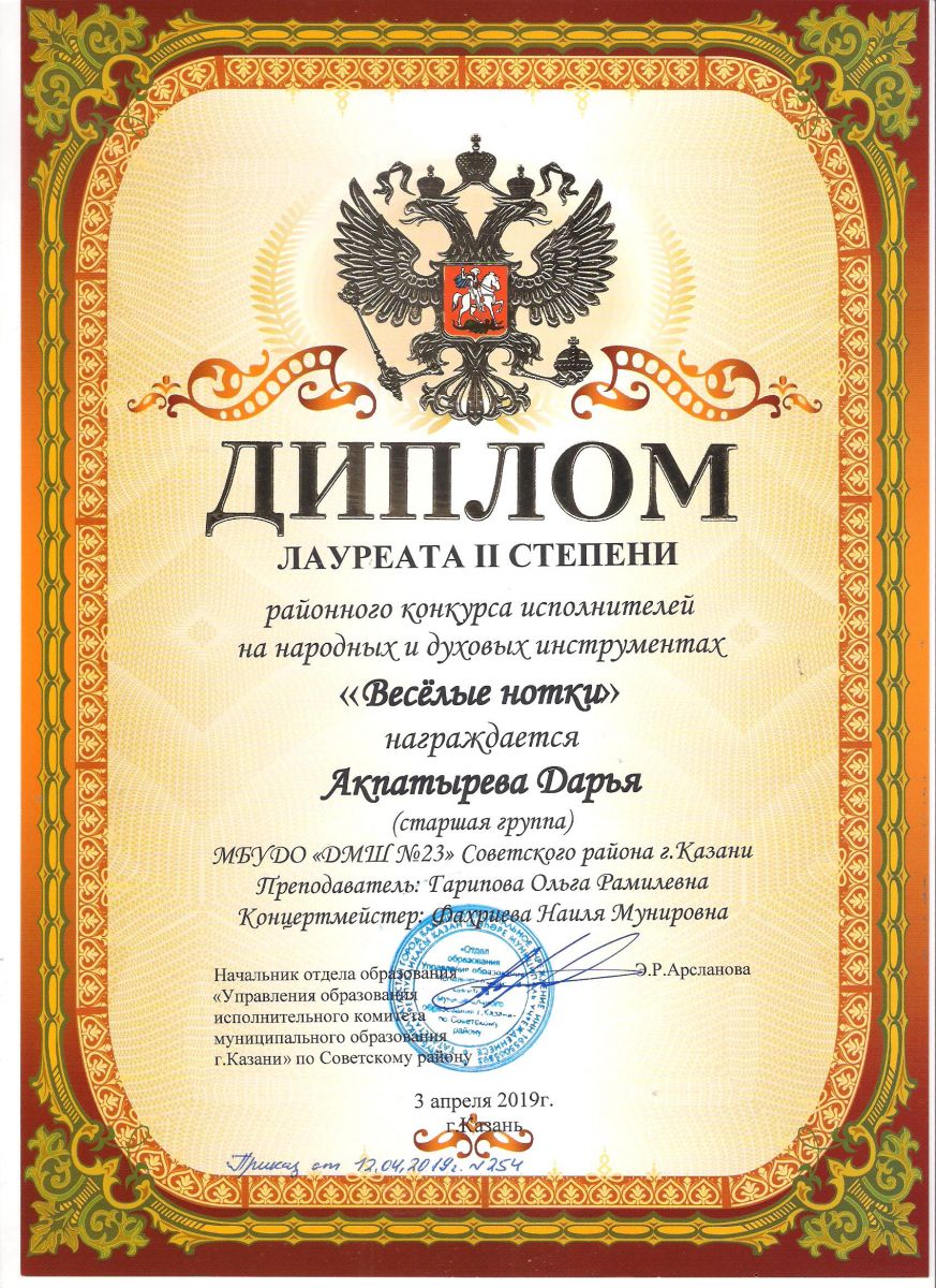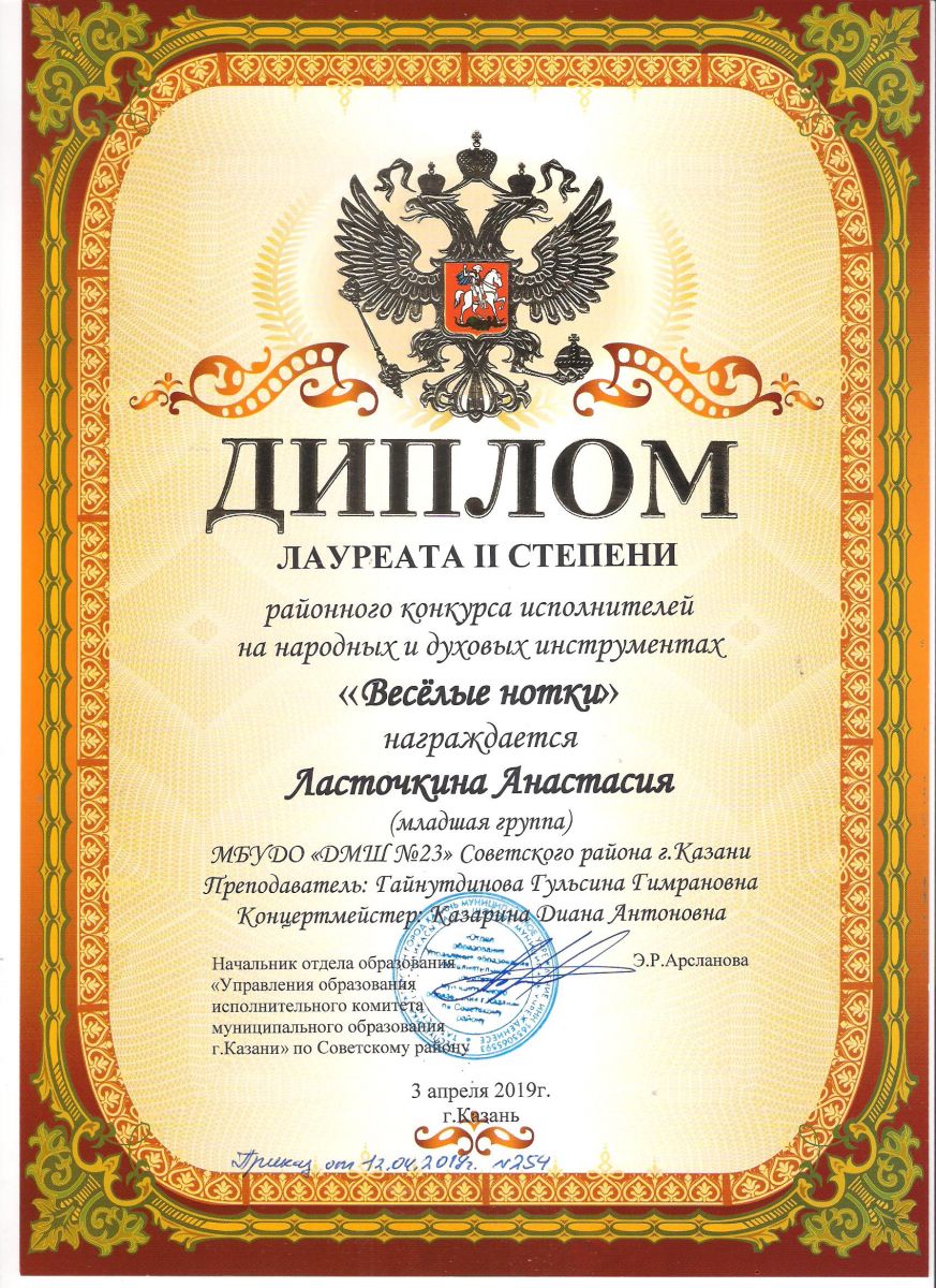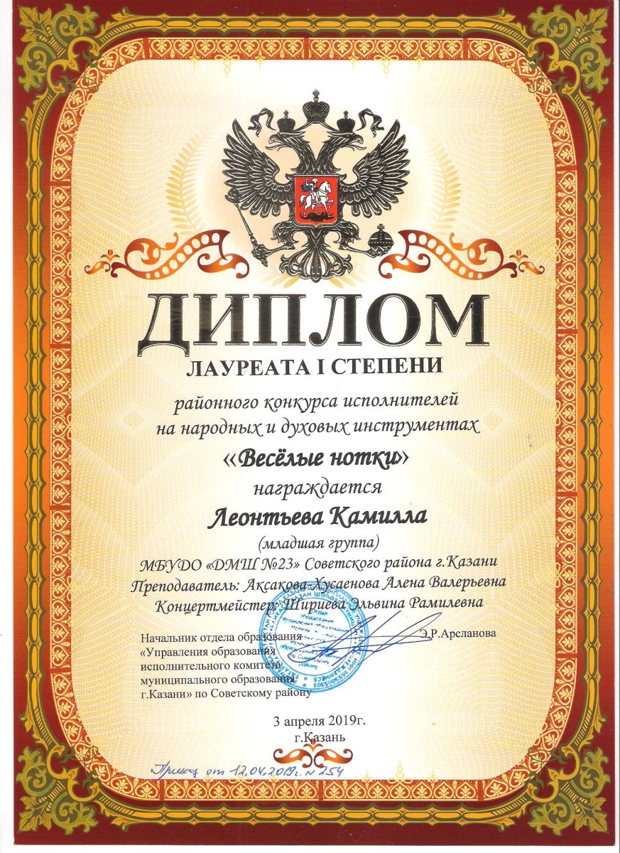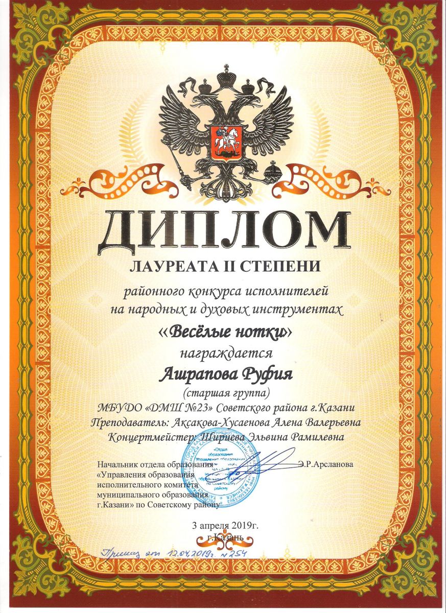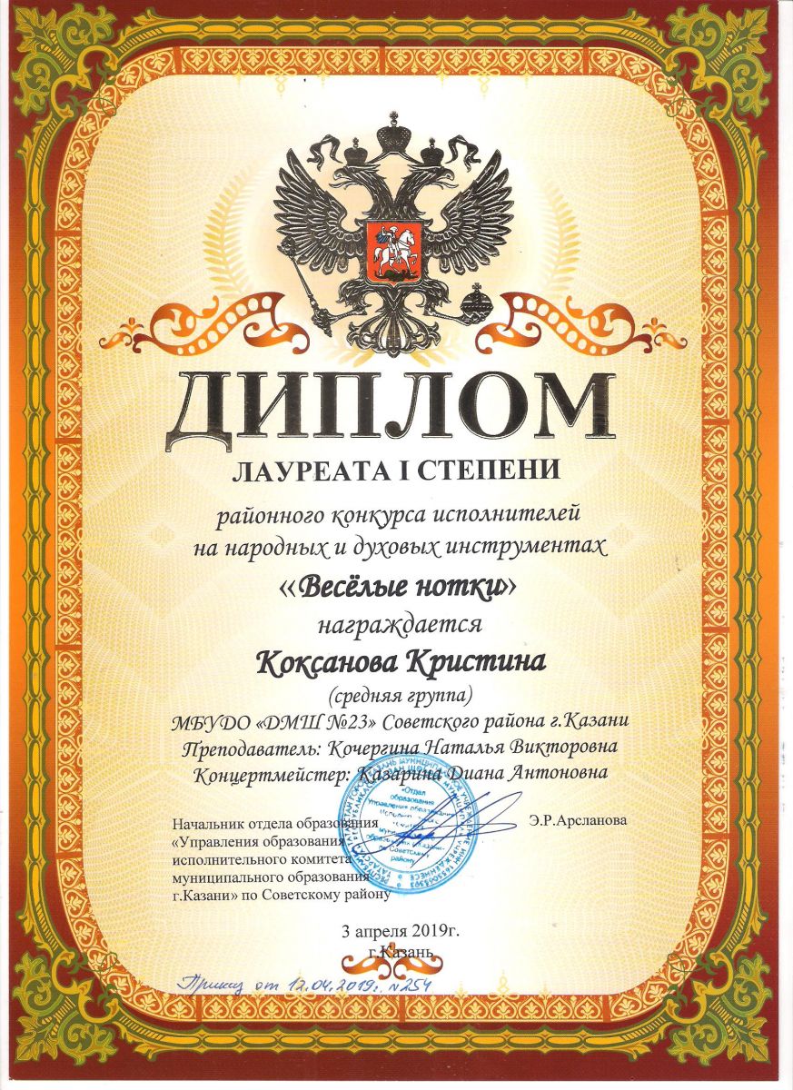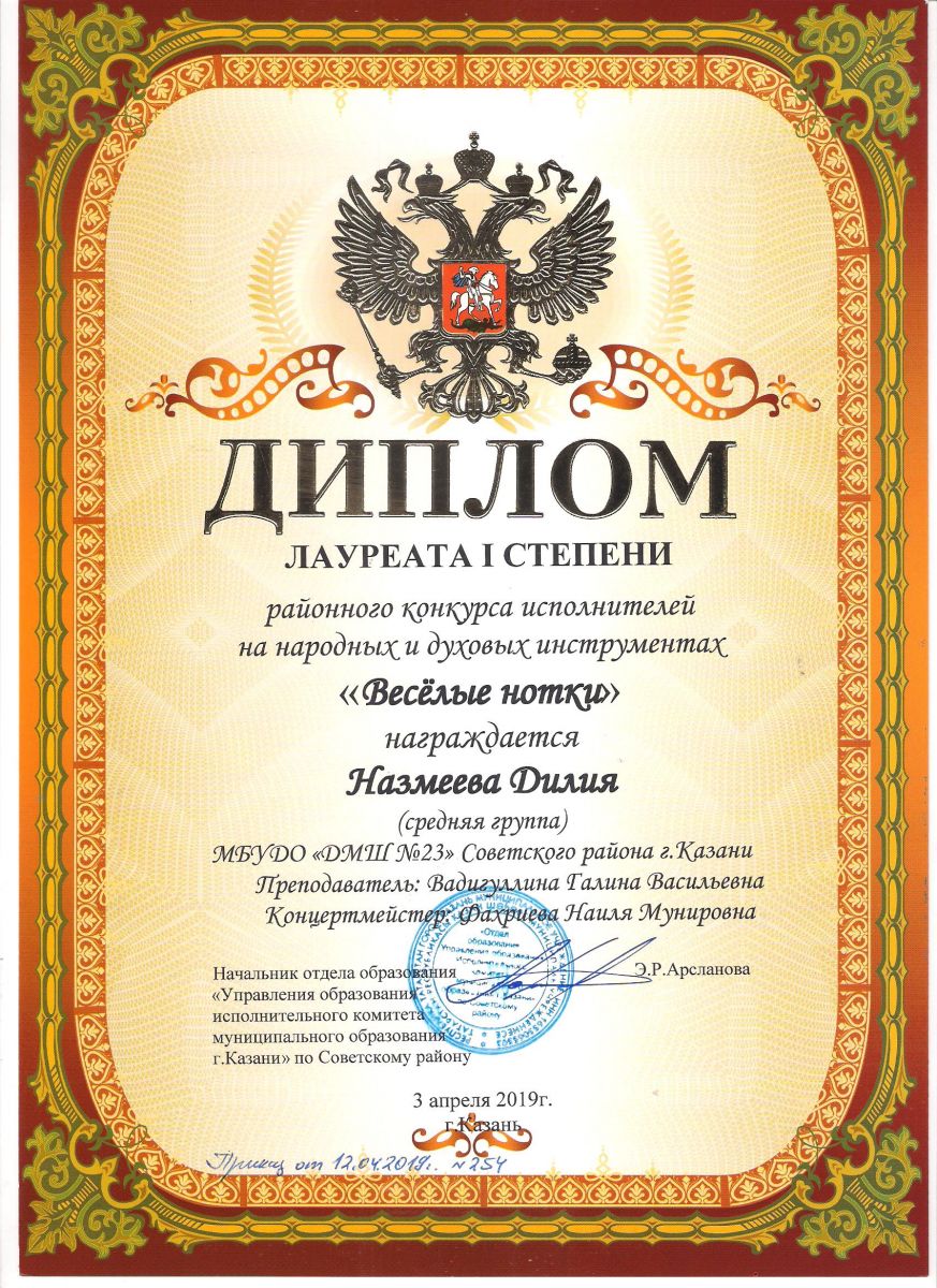 Городской конкурс татарской музыки «Кояшлы бүләк - 2019» - Диплом лауреата I степени - Тхай Арина