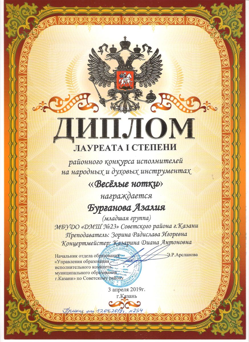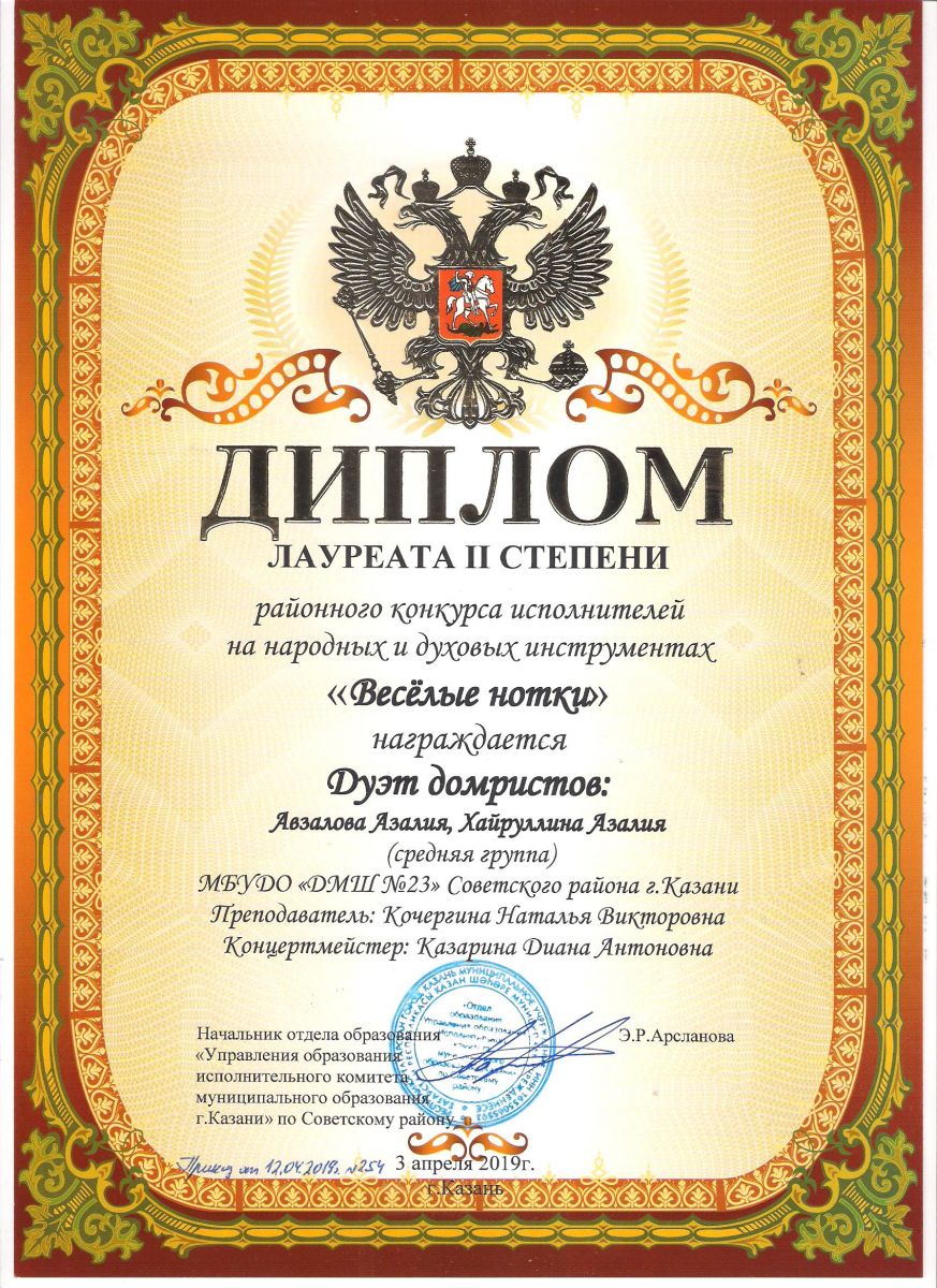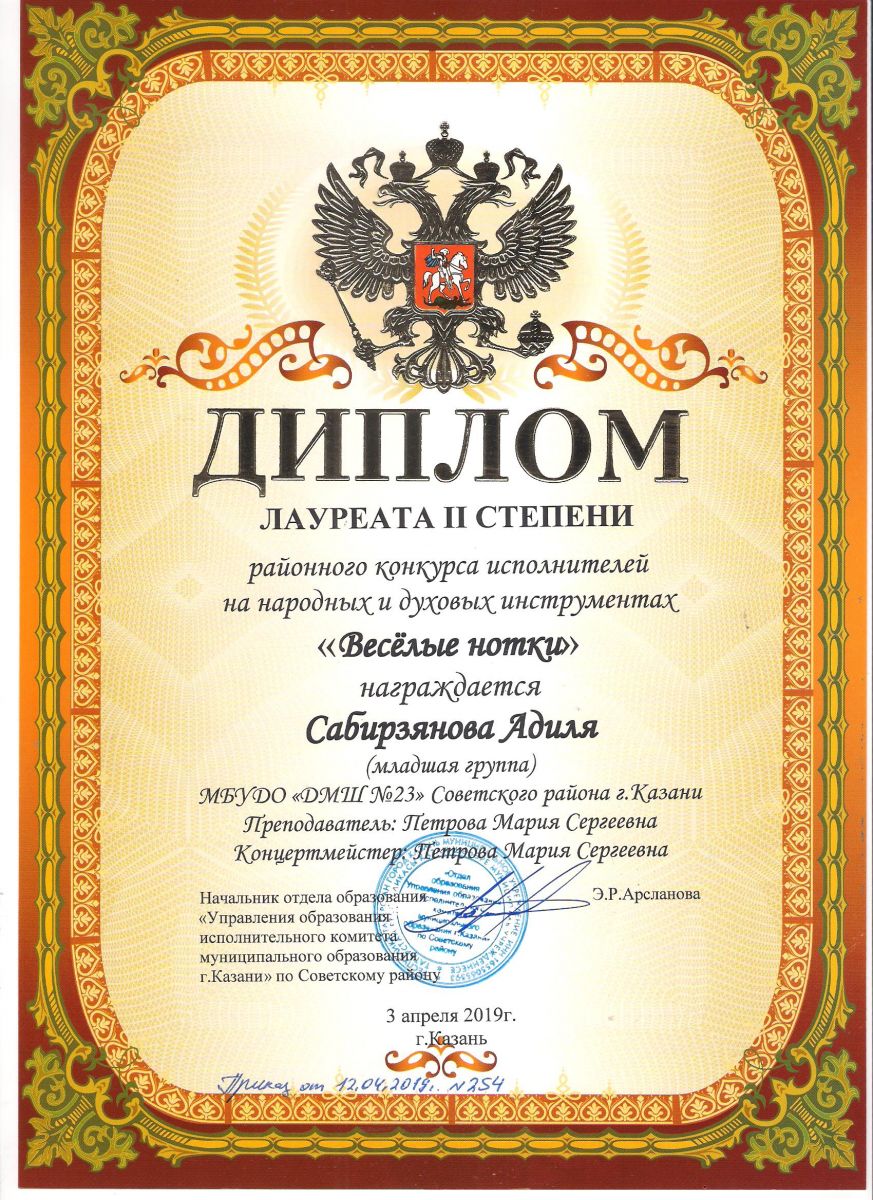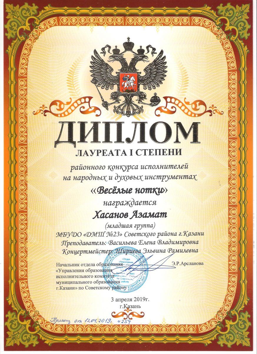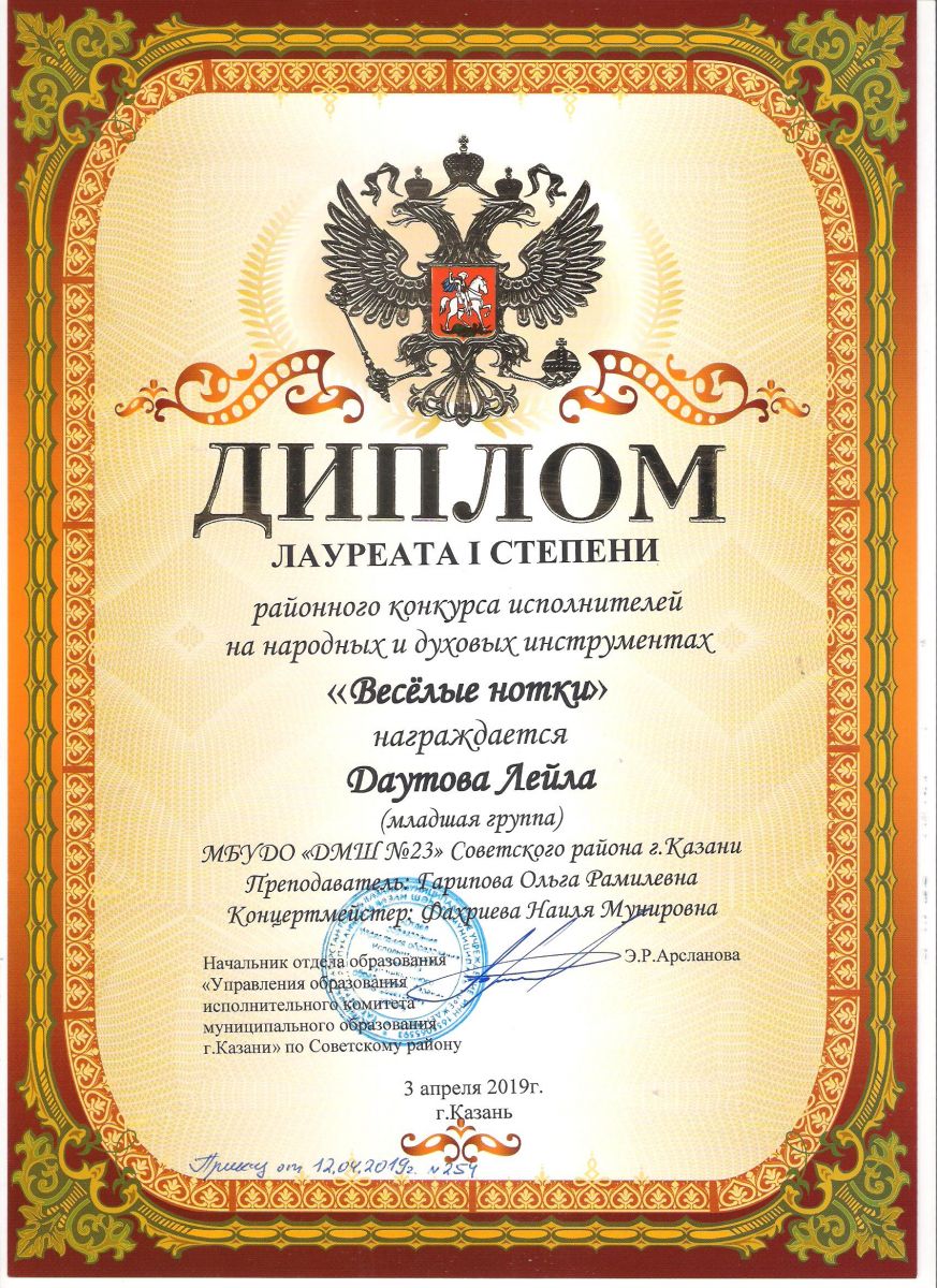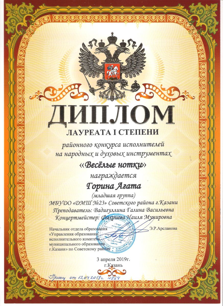 Городской конкурс татарской музыки «Кояшлы бүләк - 2019» - Диплом лауреата I степени - Тхай Арина