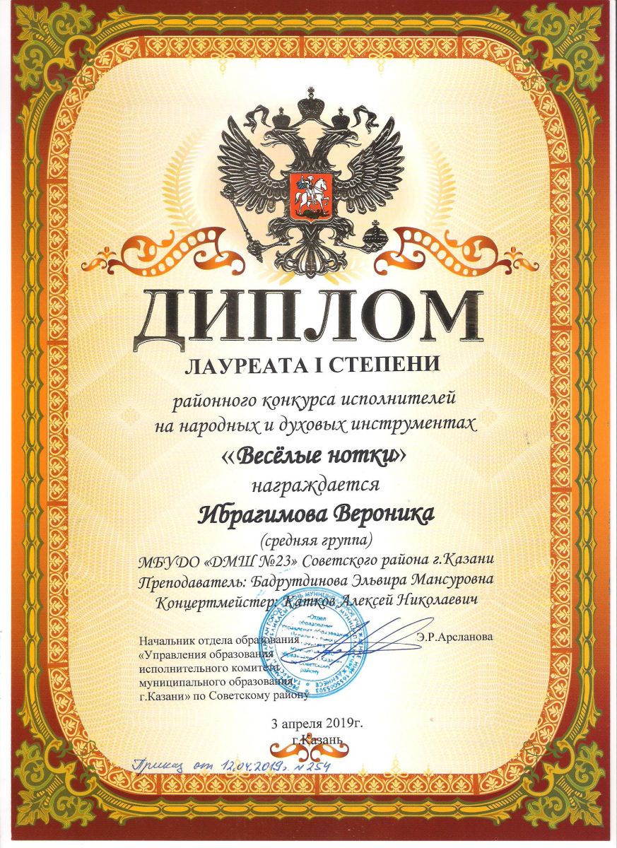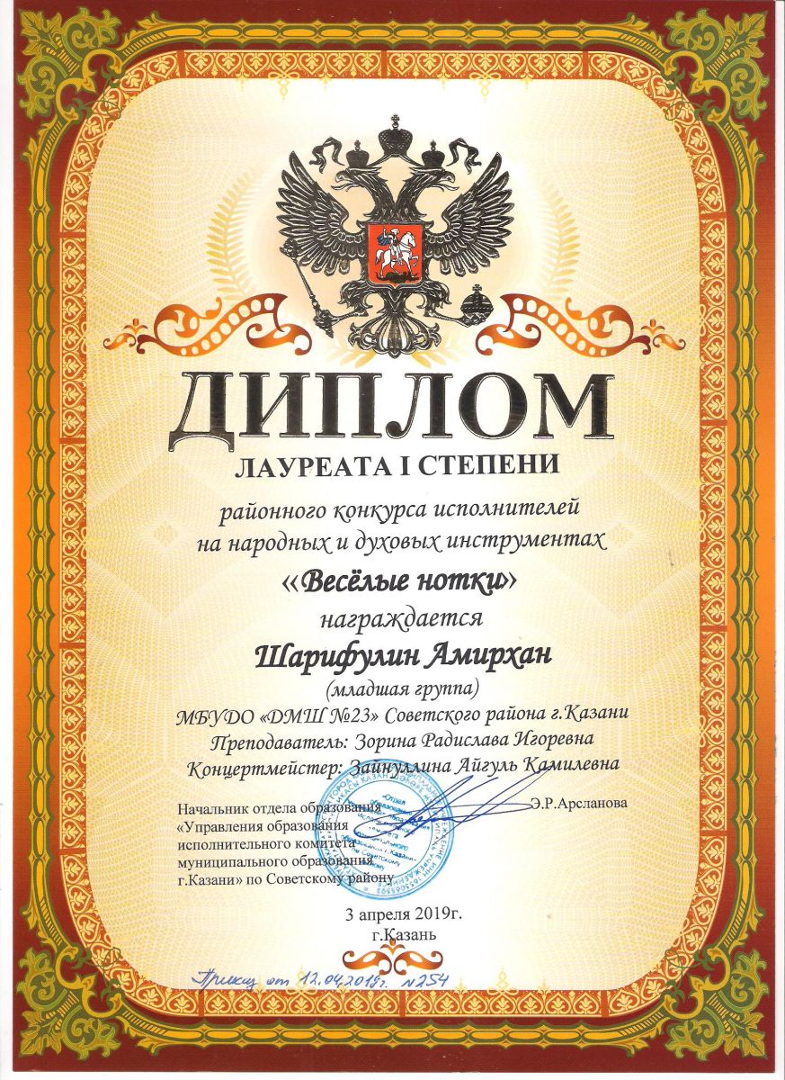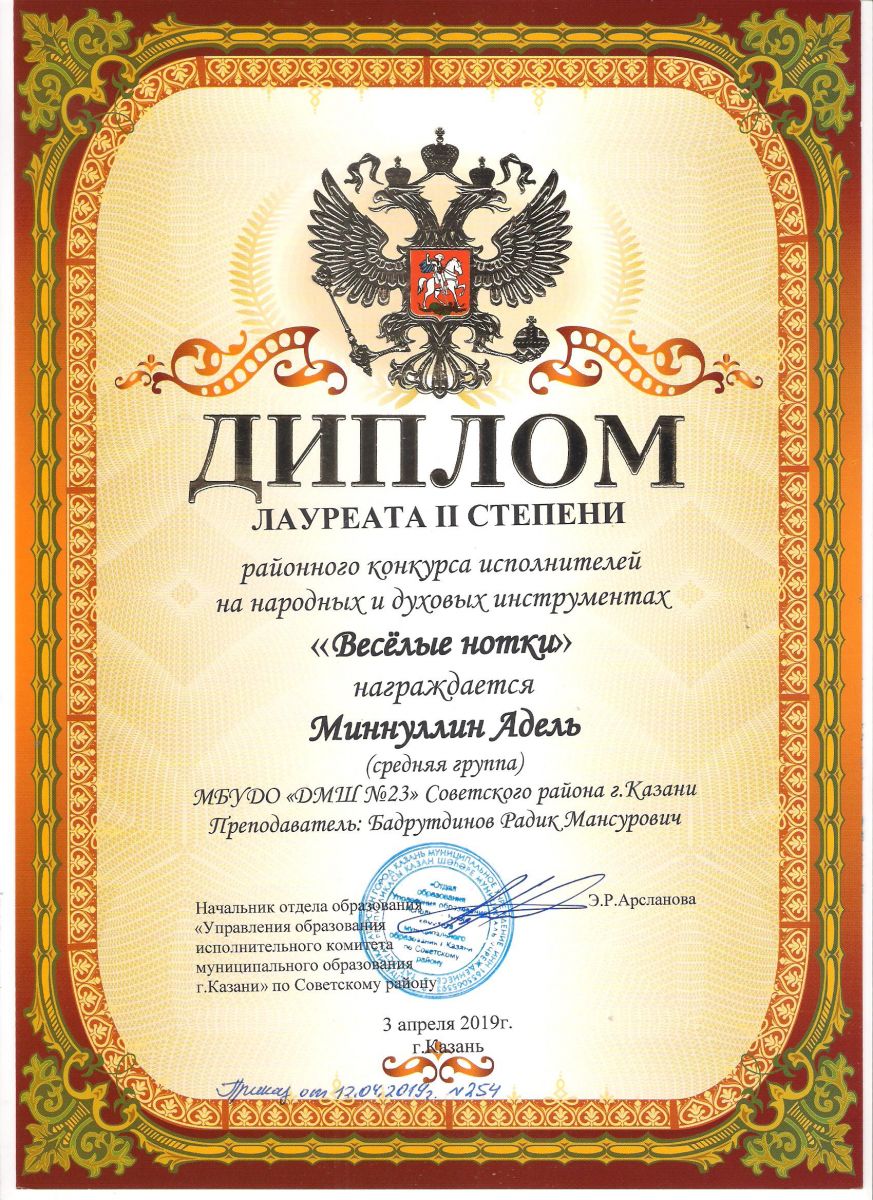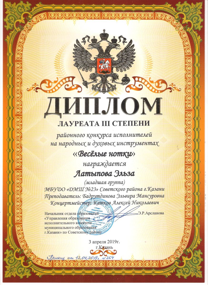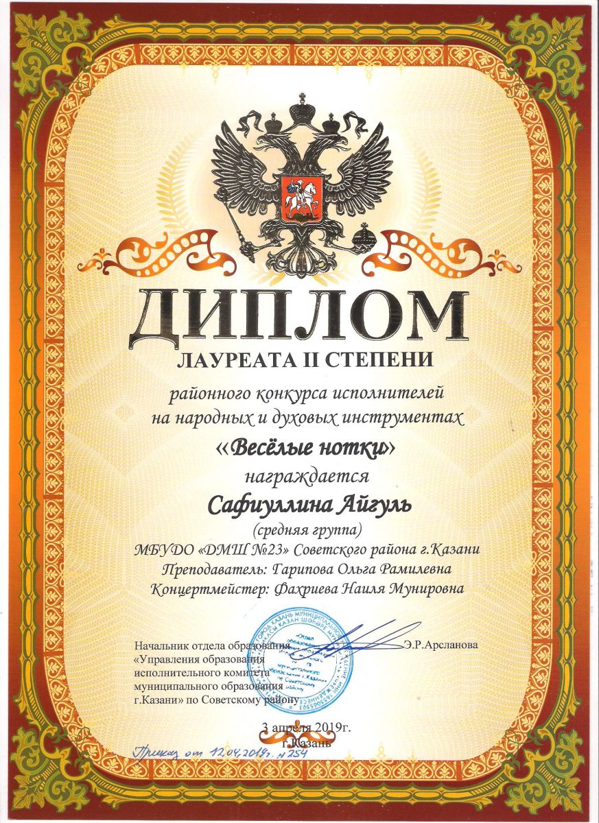 Городской конкурс татарской музыки «Кояшлы бүләк - 2019» - Диплом лауреата I степени - Тхай Арина