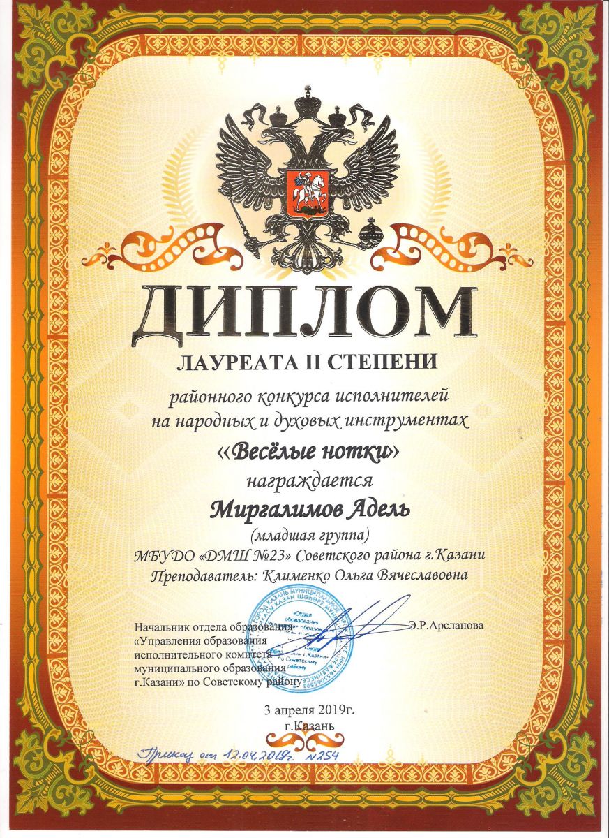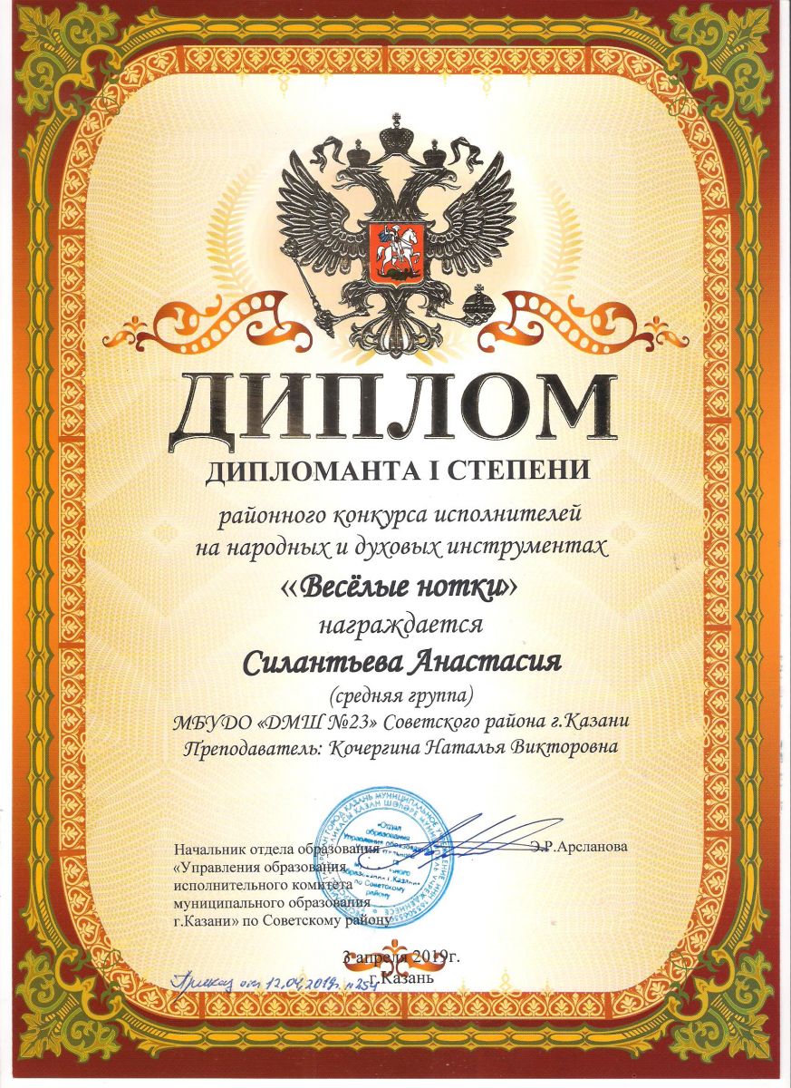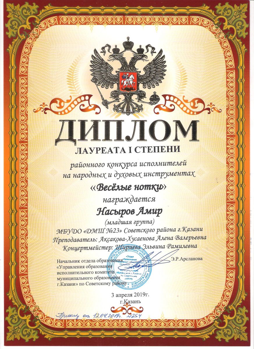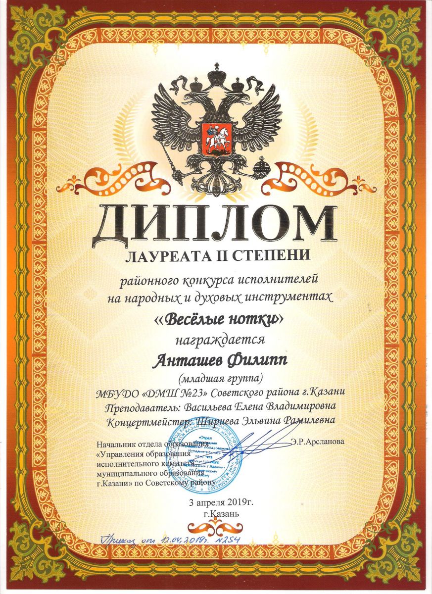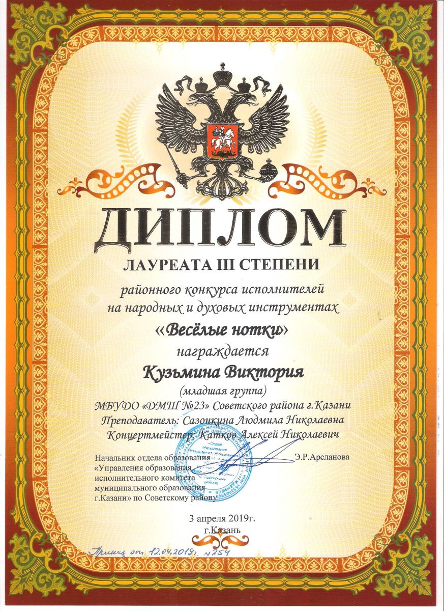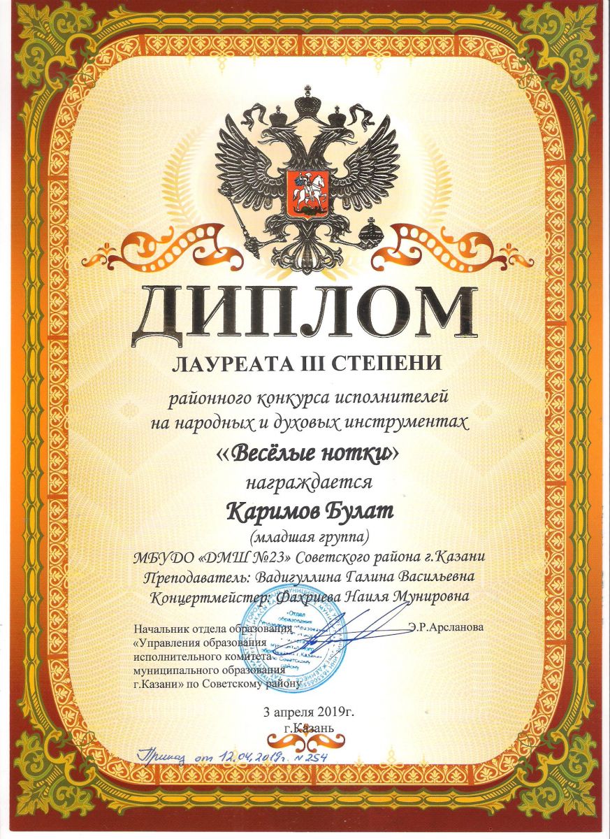 Городской конкурс татарской музыки «Кояшлы бүләк - 2019» - Диплом лауреата I степени - Тхай Арина