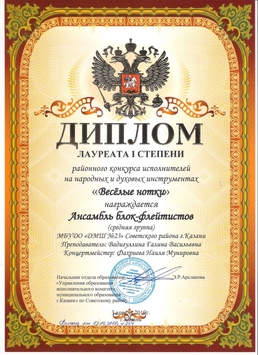 Районный конкурс исполнителей на народных и духовых инструментах "Весёлые нотки" - Диплом лауреата I степени - Ансамбль блокфлейтистов