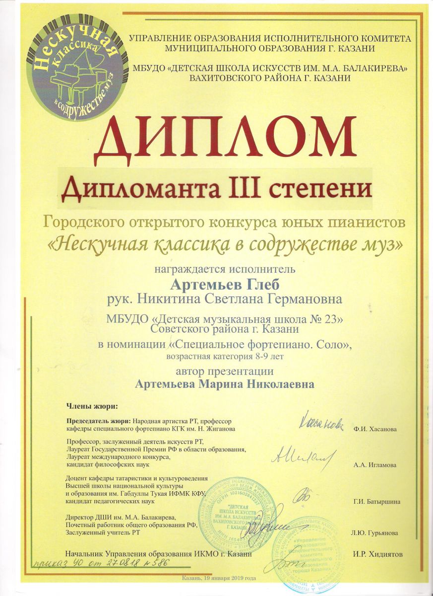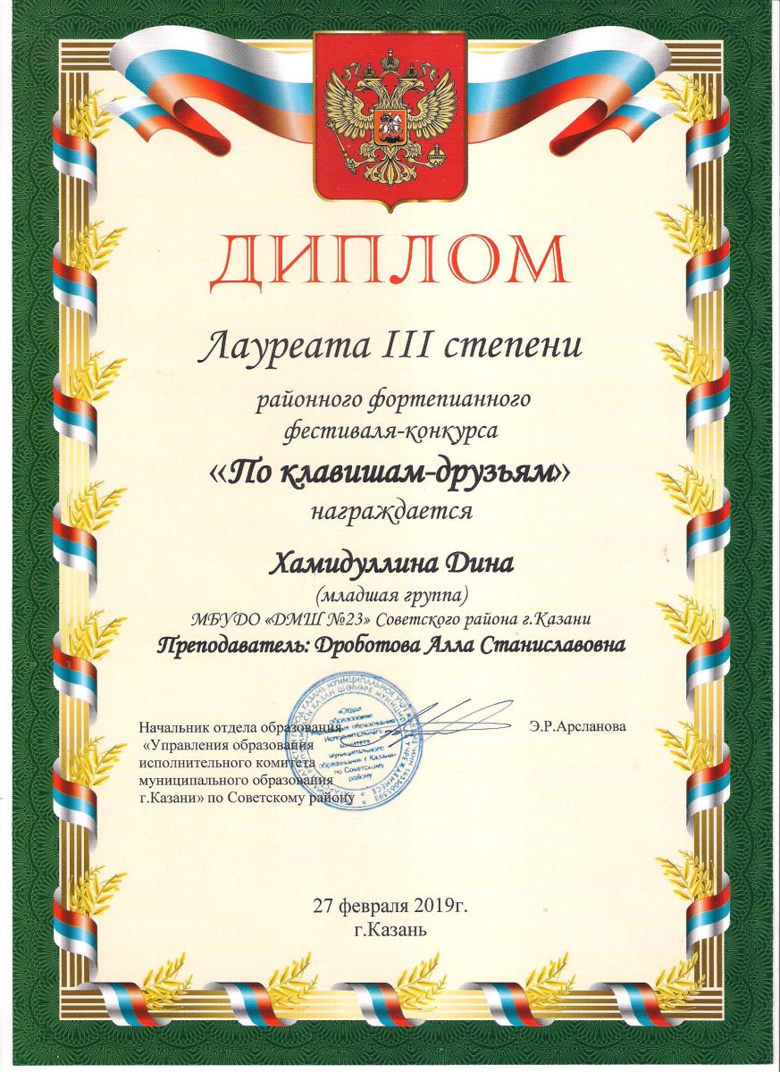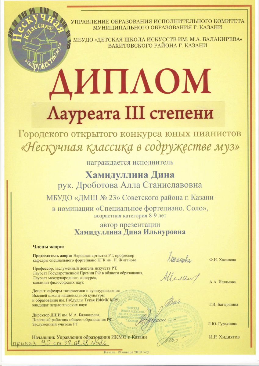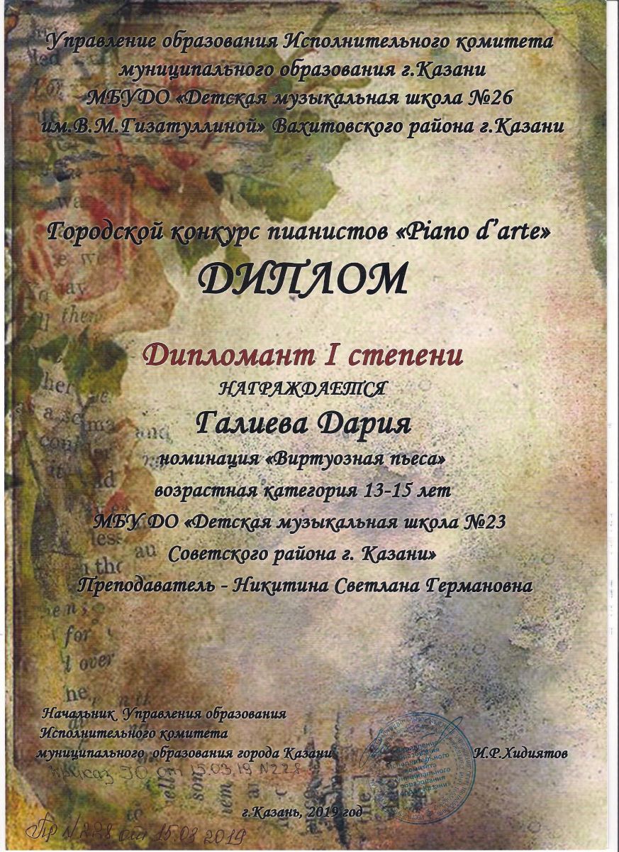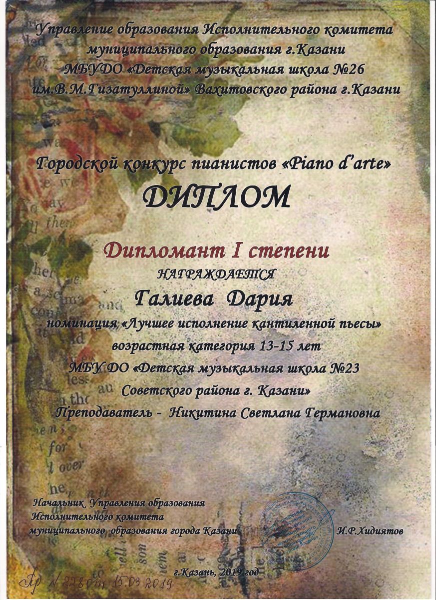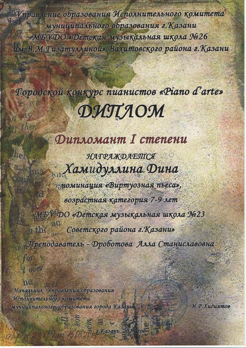 Городской конкурс пианистов "Piano d'arte" - Диплом дипломанта I степени - Хамидуллина Дина