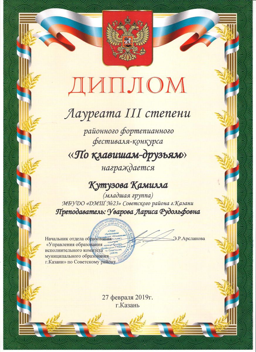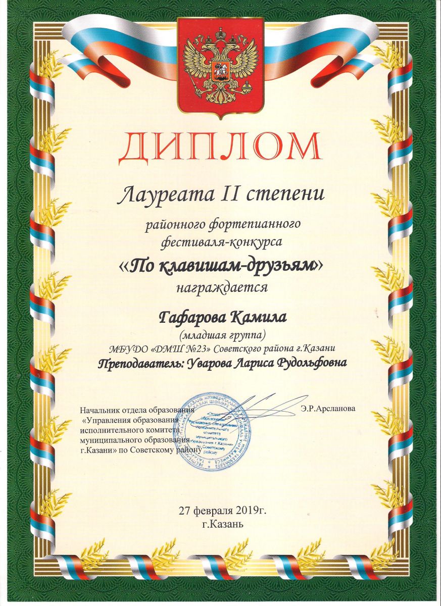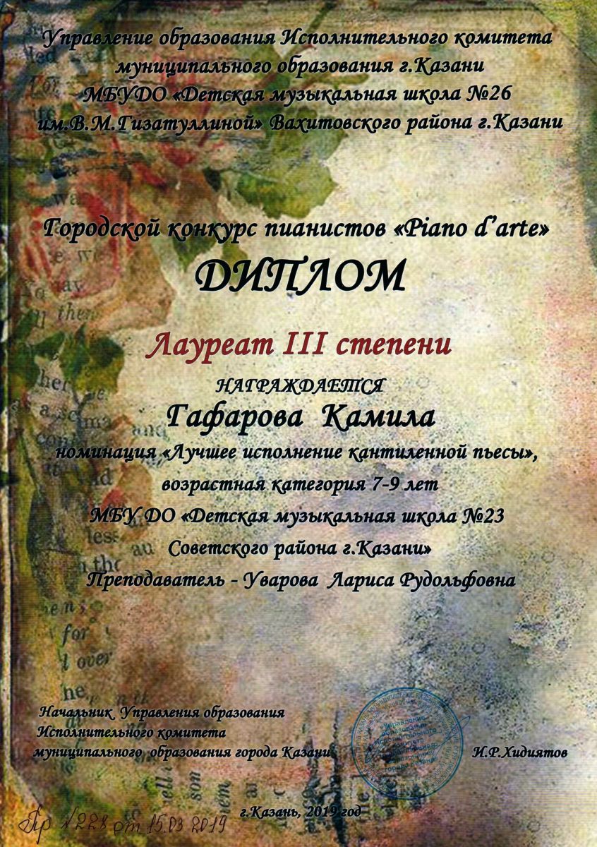 Городской конкурс пианистов "Piano d'arte" - Диплом лауреата III степени - Гафарова Камила