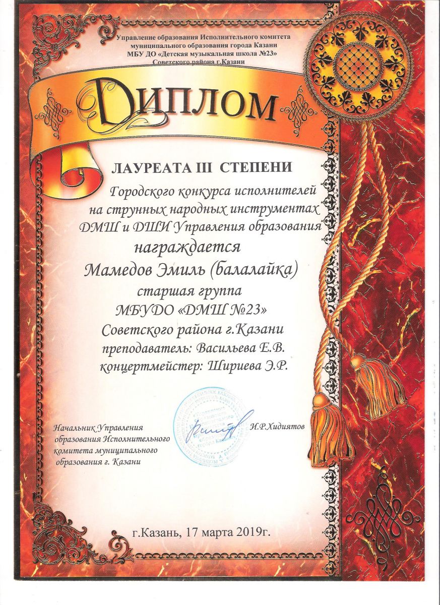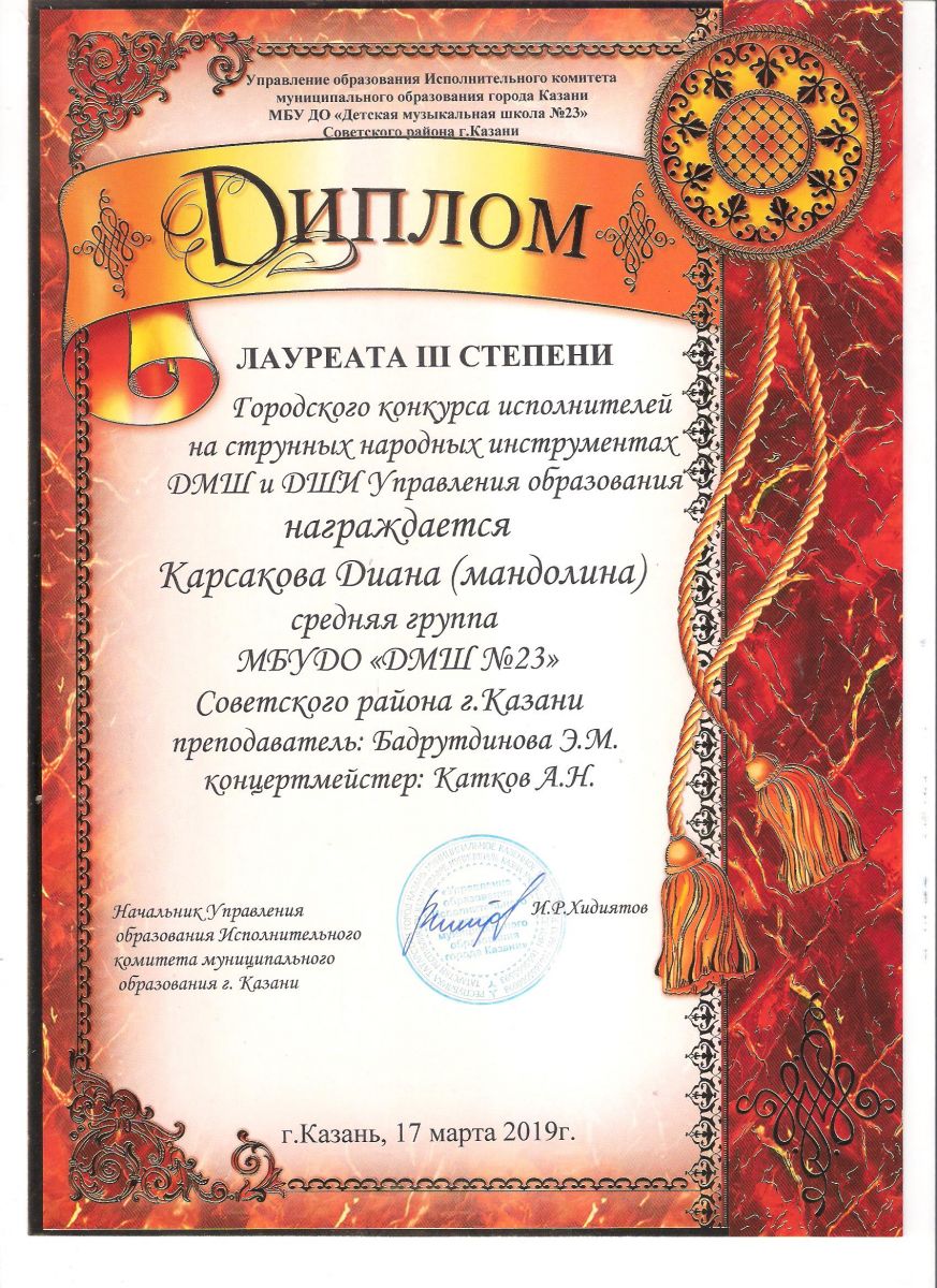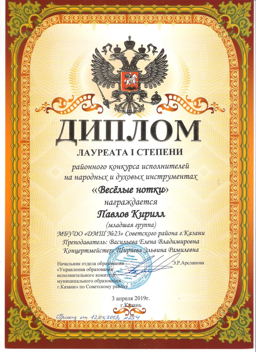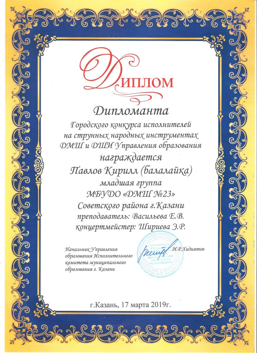 Городской конкурс исполнителей на струнных народных инструментах - Диплом дипломанта - Павлов Кирилл