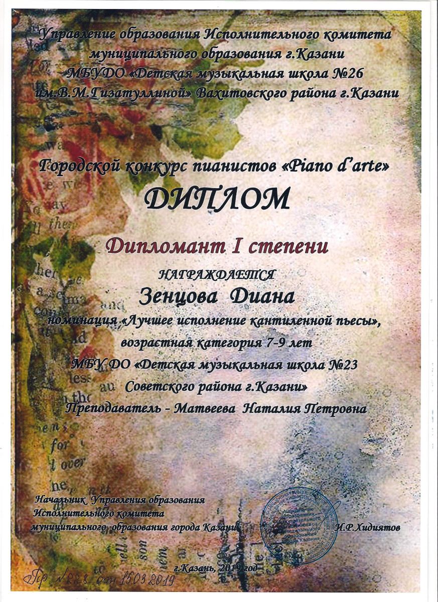 Городской конкурс пианистов "Piano d'arte" - Диплом дипломанта I степени - Зенцова Диана