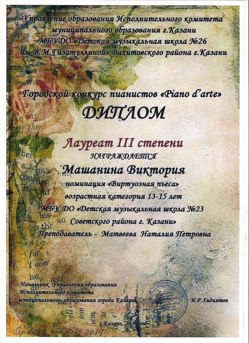Городской конкурс пианистов "Piano d'arte" - Диплом лауреата III степени - Машанина Виктория