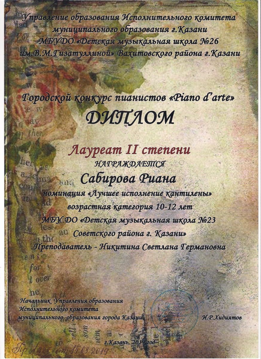 Городской конкурс пианистов "Piano d'arte" - Диплом лауреата II степени - Сабирова Риана