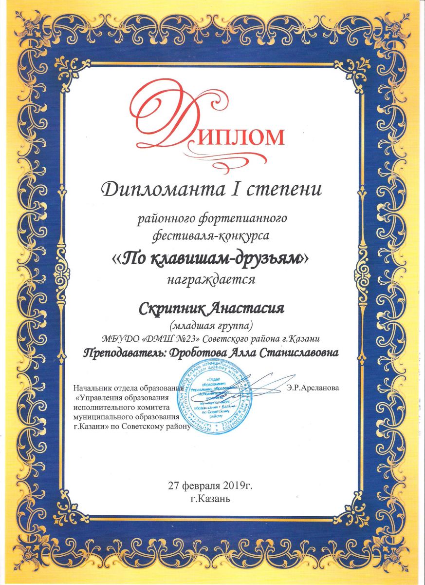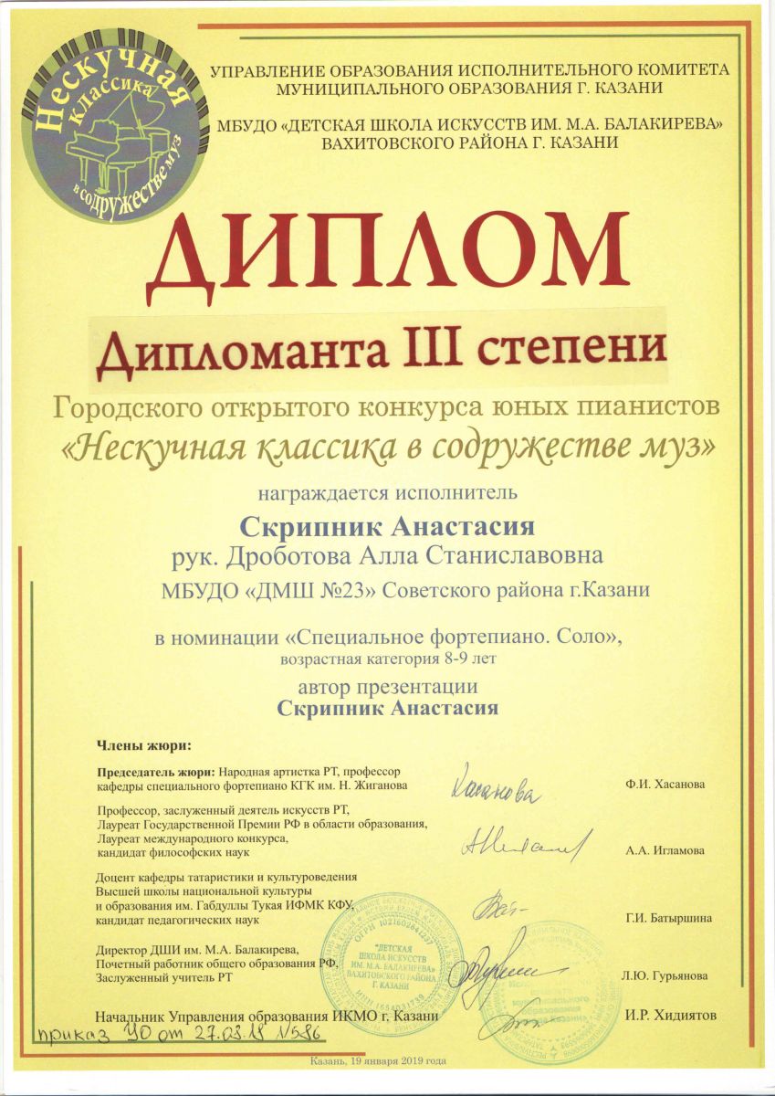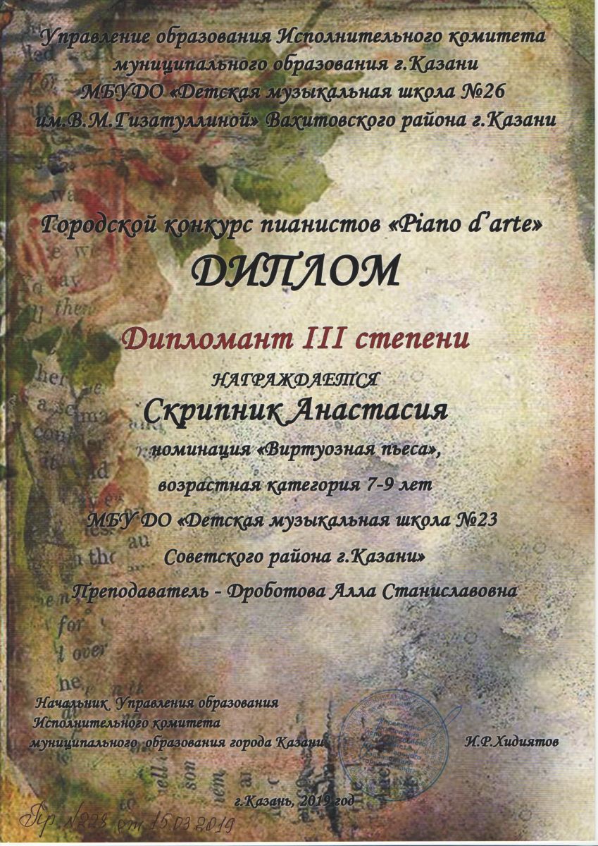 Городской конкурс пианистов "Piano d'arte" - Диплом дипломанта III степени - Скрипник Анастасия