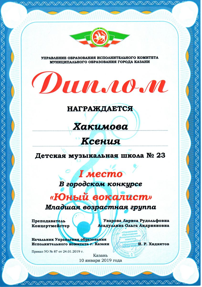 Городской конкурс "Юный вокалист" - Диплом -1 место - Хакимова Ксения