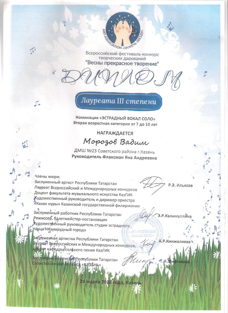 Всероссийский фестиваль-конкурс творческих дарований "Весны прекрасное творение" - Диплом лауреата 3 степени - Морозов Вадим (преподаватель: Флаксман Я.А.)