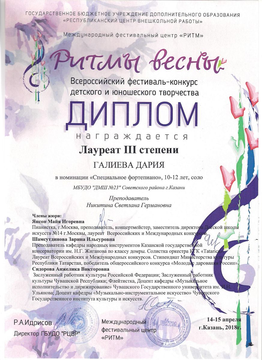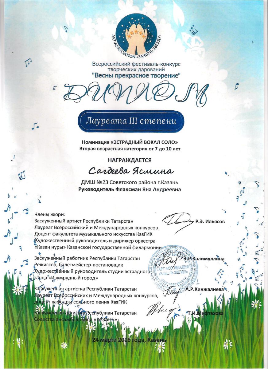 Всероссийский фестиваль-конкурс творческих дарований "Весны прекрасное творение" - Диплом лауреата 3 степени - Сагдеева Ясмина (преподаватель: Флаксман Я.А.)