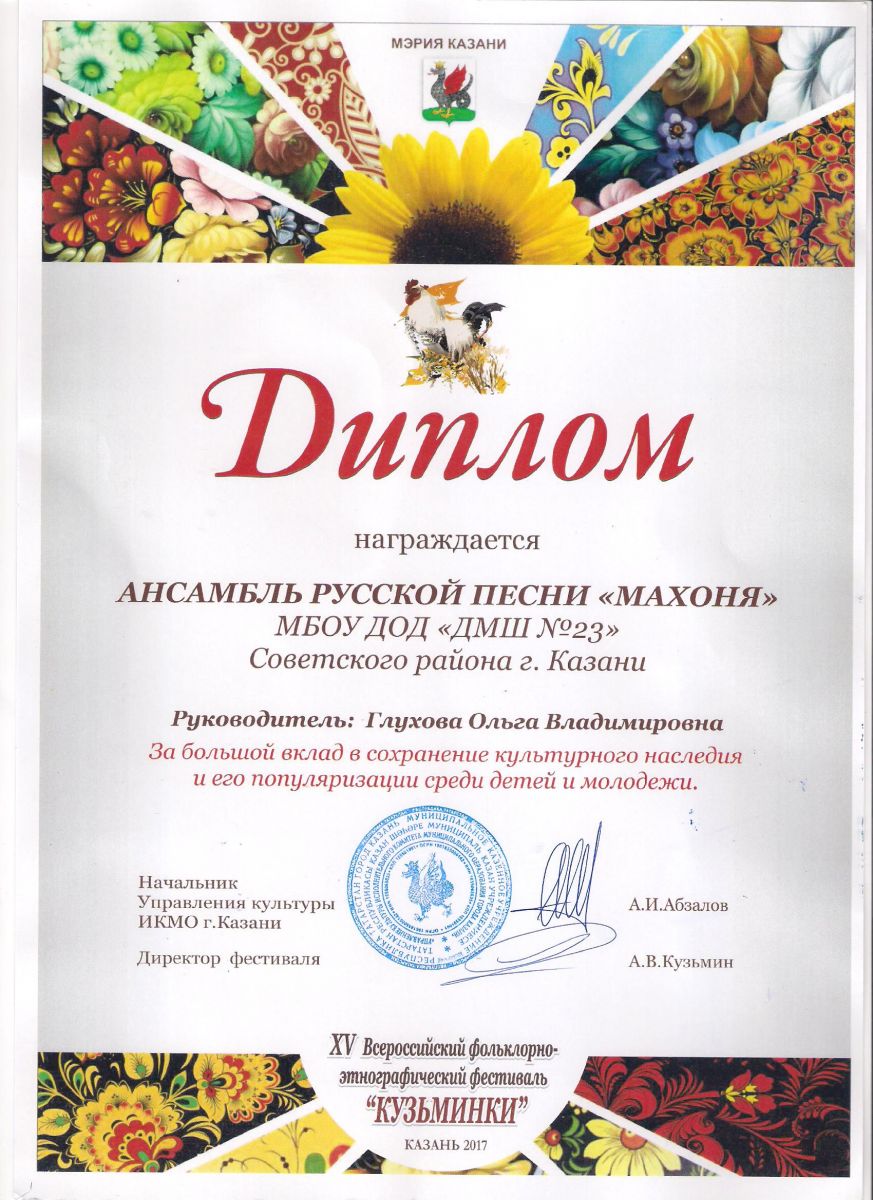 XV Всероссийский фольклорно-этнографический фестиваль "Кузьминки" - Диплом - Ансамбль народной песни "Махоня" (Руководитель: Глухова О.В., концертмейстер: Бадрутдинов Р.М.)