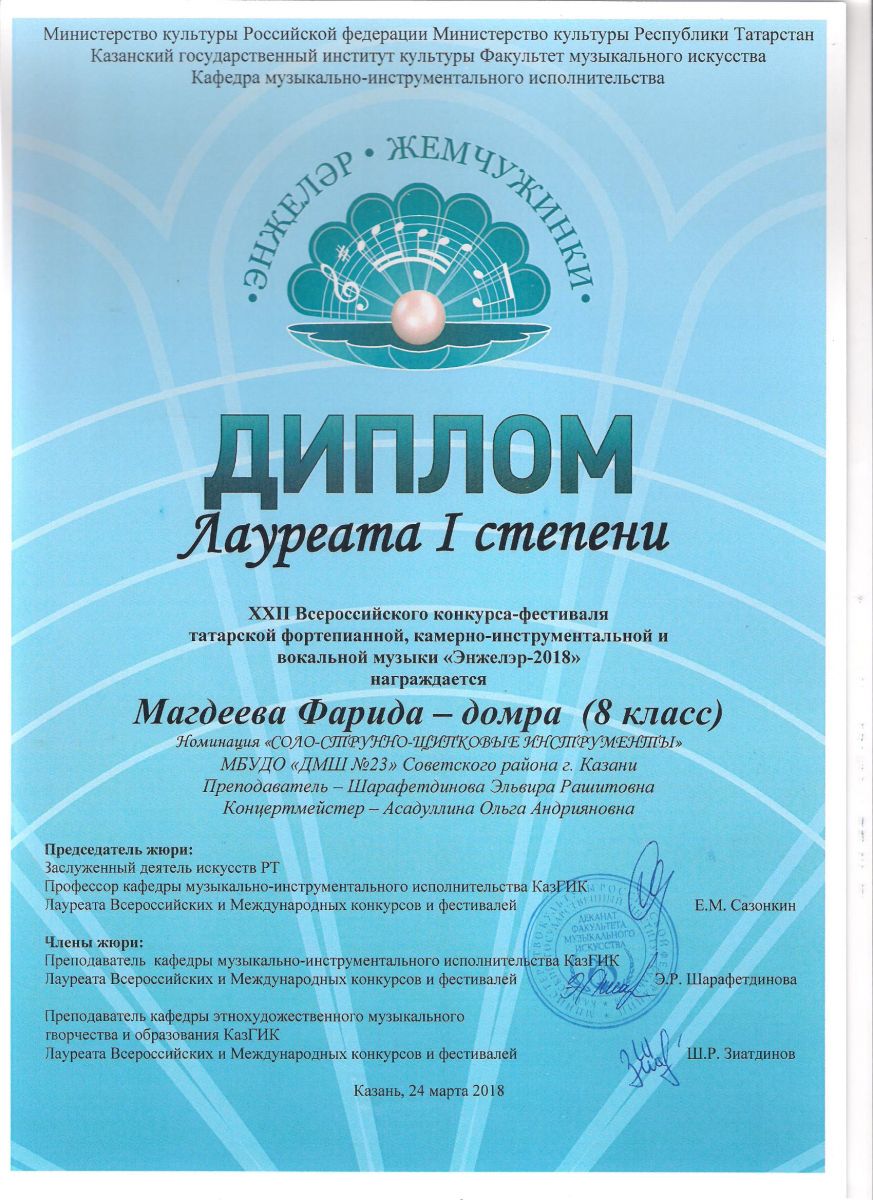 XXII Всероссийский конкурс-фестиваль татарской фортепианной, камерно-инструментальной и вокальной музыки "Энжелэр-2018" - Диплом лауреата 1 степени - Магдеева Фарида (преподаватель: Шарафетдинова Э.Р., концертмейстер: Асадуллина О.А.)