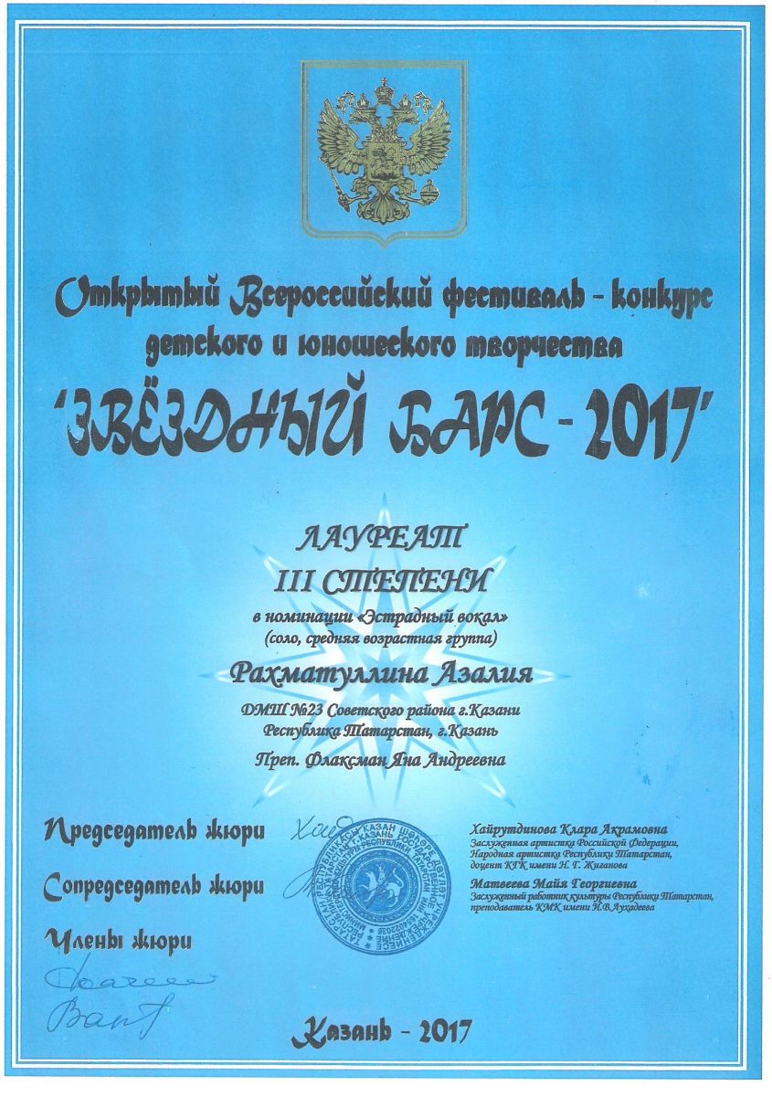 Открытый Всероссийский фестиваль-конкурс детского и юношеского творчества "Звёздный барс-2017" - Диплом лауреата 3 степени - Рахматуллина Азалия (преподаватель: Флаксман Я.А.)
